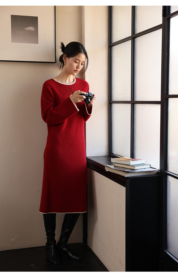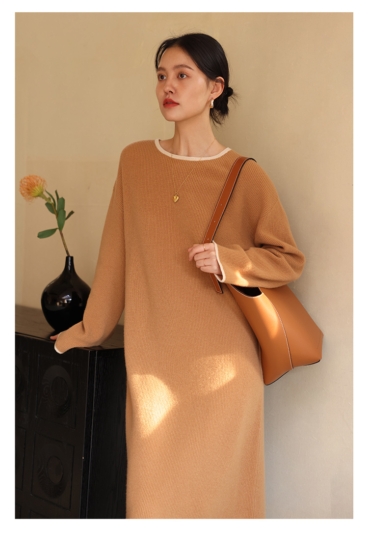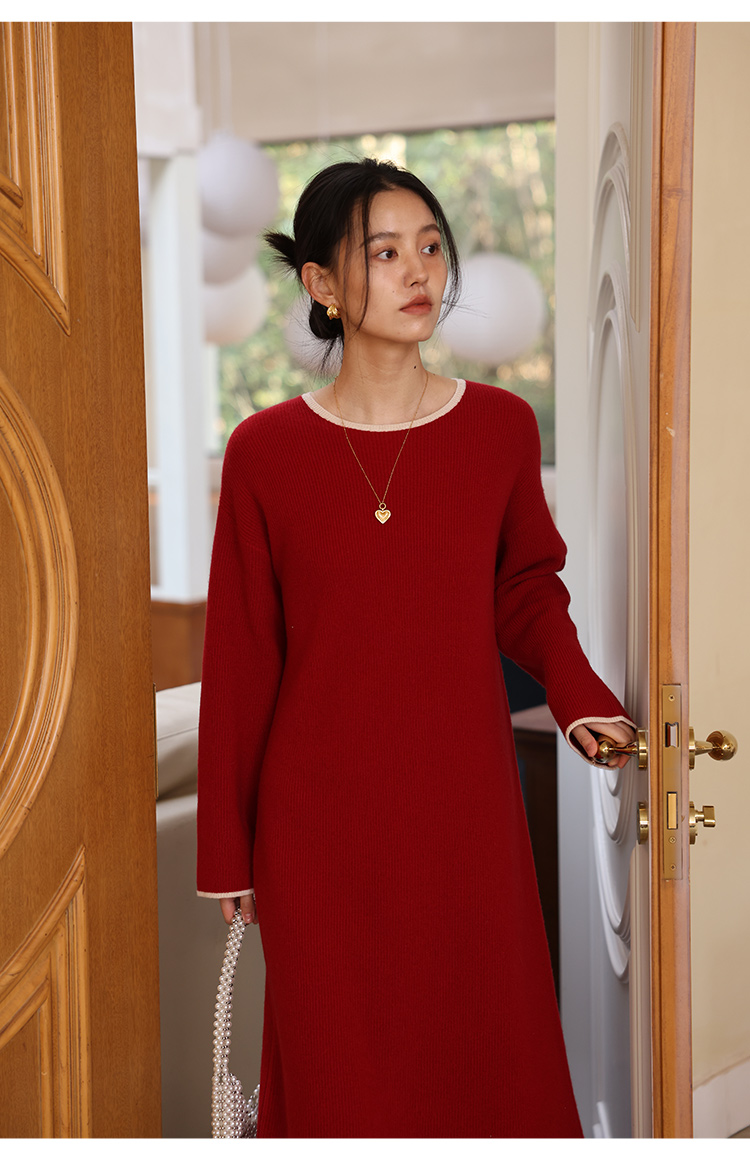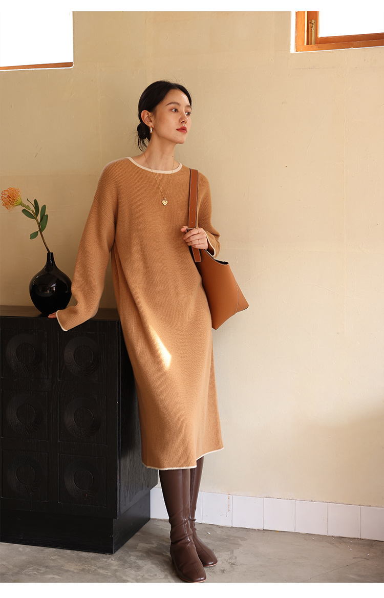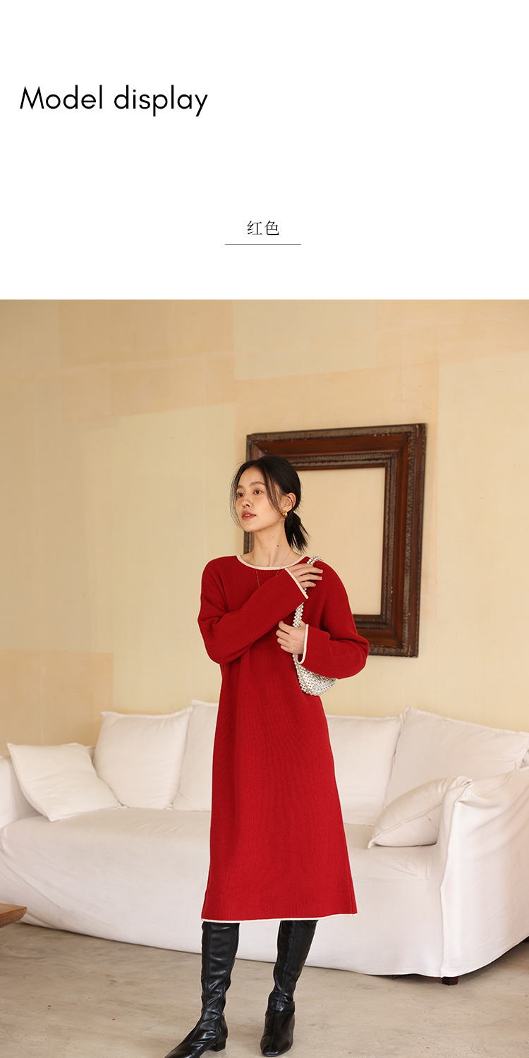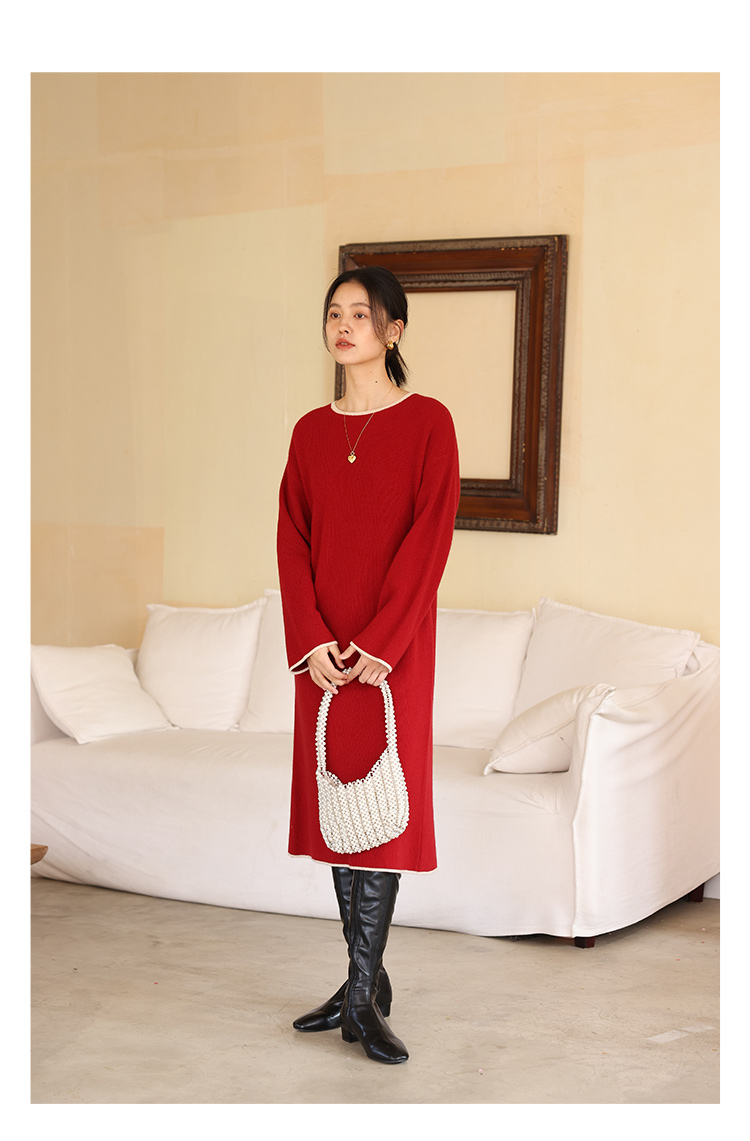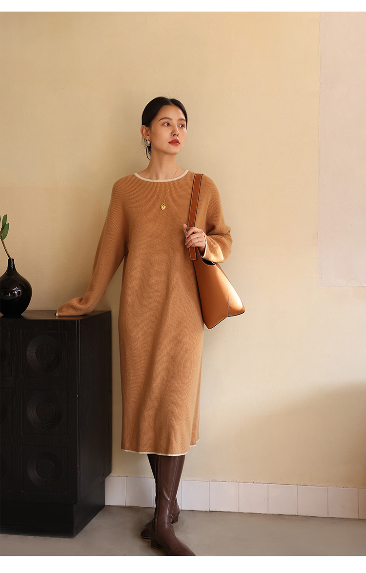 HeyDress100绵羊毛针织连衣裙冬季法式复古宽松慵懒感撞色气质裙