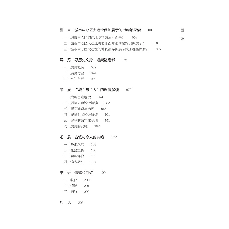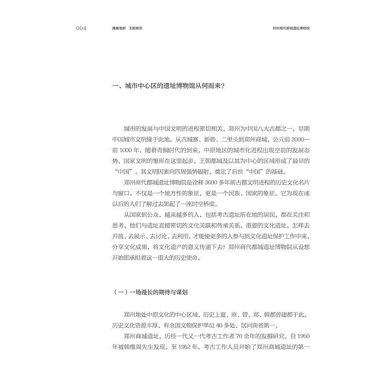 本书系“中国博物馆陈列展览精品·策展笔记”丛书之一种,旨在提炼、整理展览的创新思路、实践经验与示范意义,提高我国博物馆陈列展览的整体水平,守护好、传承好、展示好中华优秀传统文化。本书以郑州商都遗址博物院基本陈列为依托,全面真实地梳理和记录展览筹备过程,多角度地解析和呈现展览本体,并对展览内涵和学术价值进行深度诠释。本书分为“引言”“导览”“策展”“观展”“结语”五章,从内容设计、形式设计、布展宣传、观众体验等视角对展览进行全面性阐释,为新时代博物馆展览策划提供思考方向。