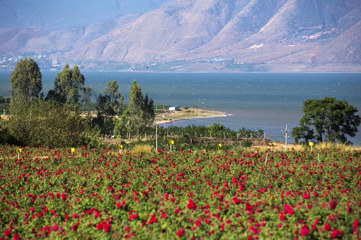 玫瑰园位于丽江程海湖畔,这里海拔1530米,年均气温18.5°C,年均降水量732.4毫米,得天独厚的地理和环境气候,让玫瑰花在冬季以后还有玫瑰产出。