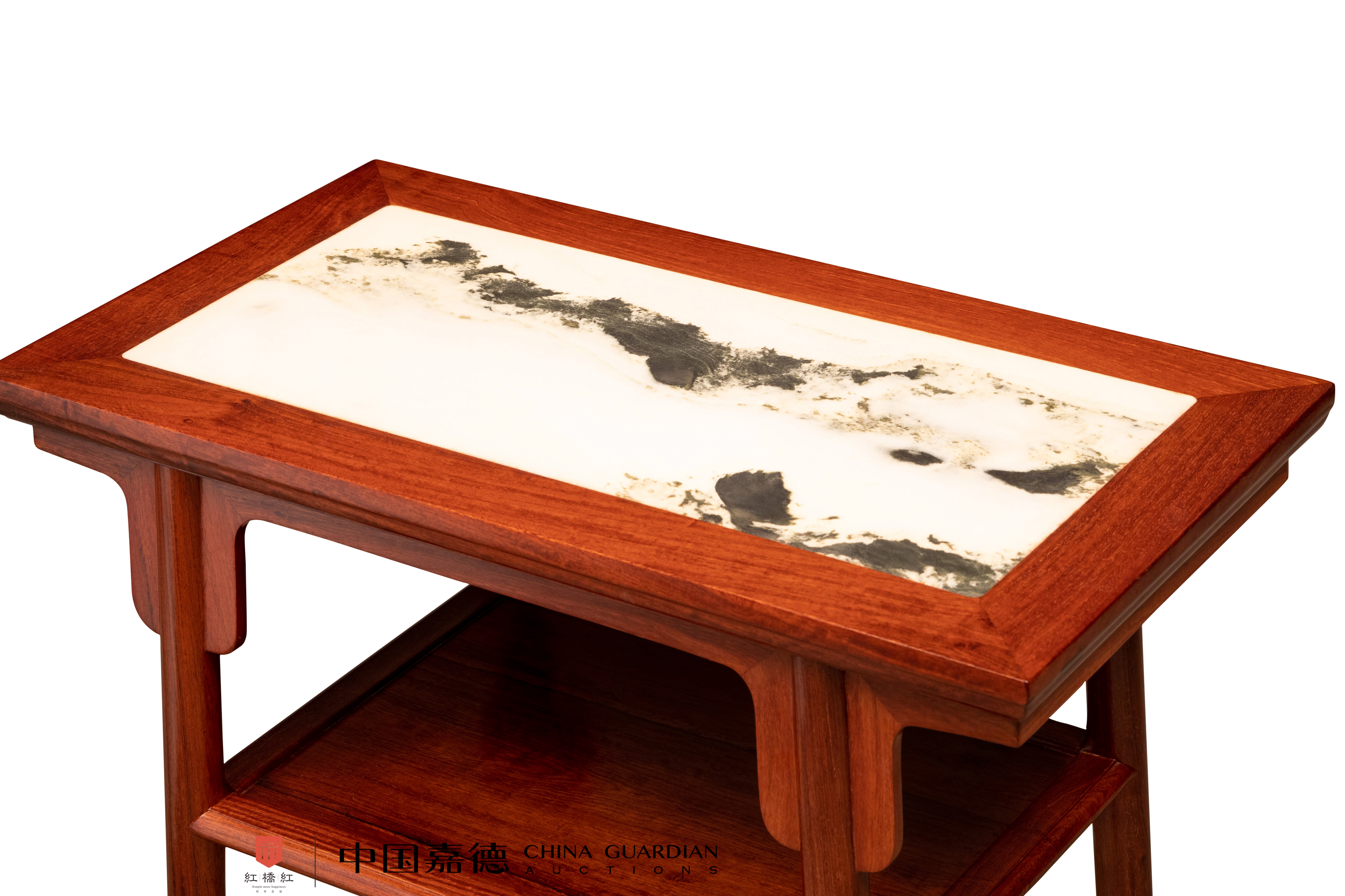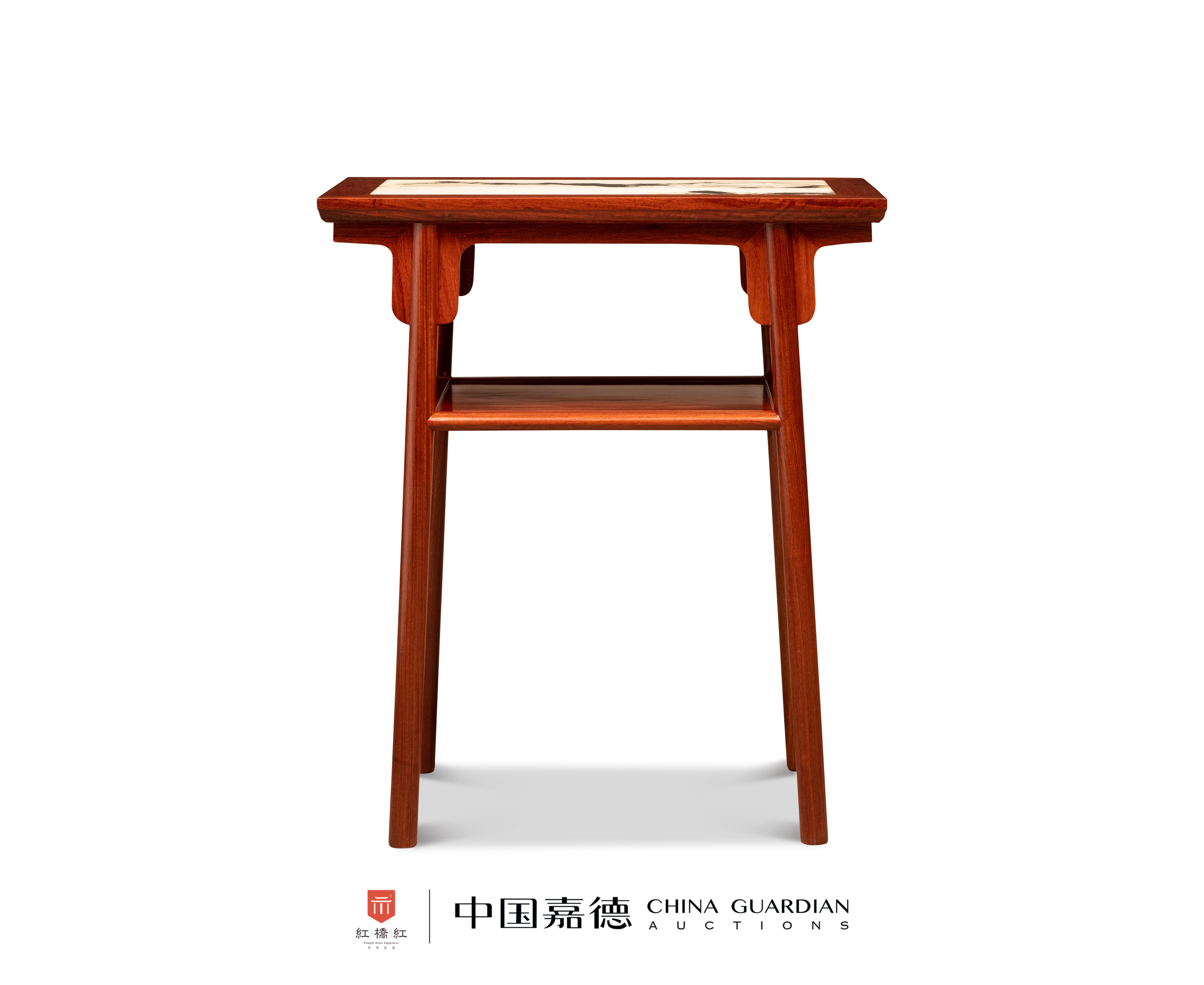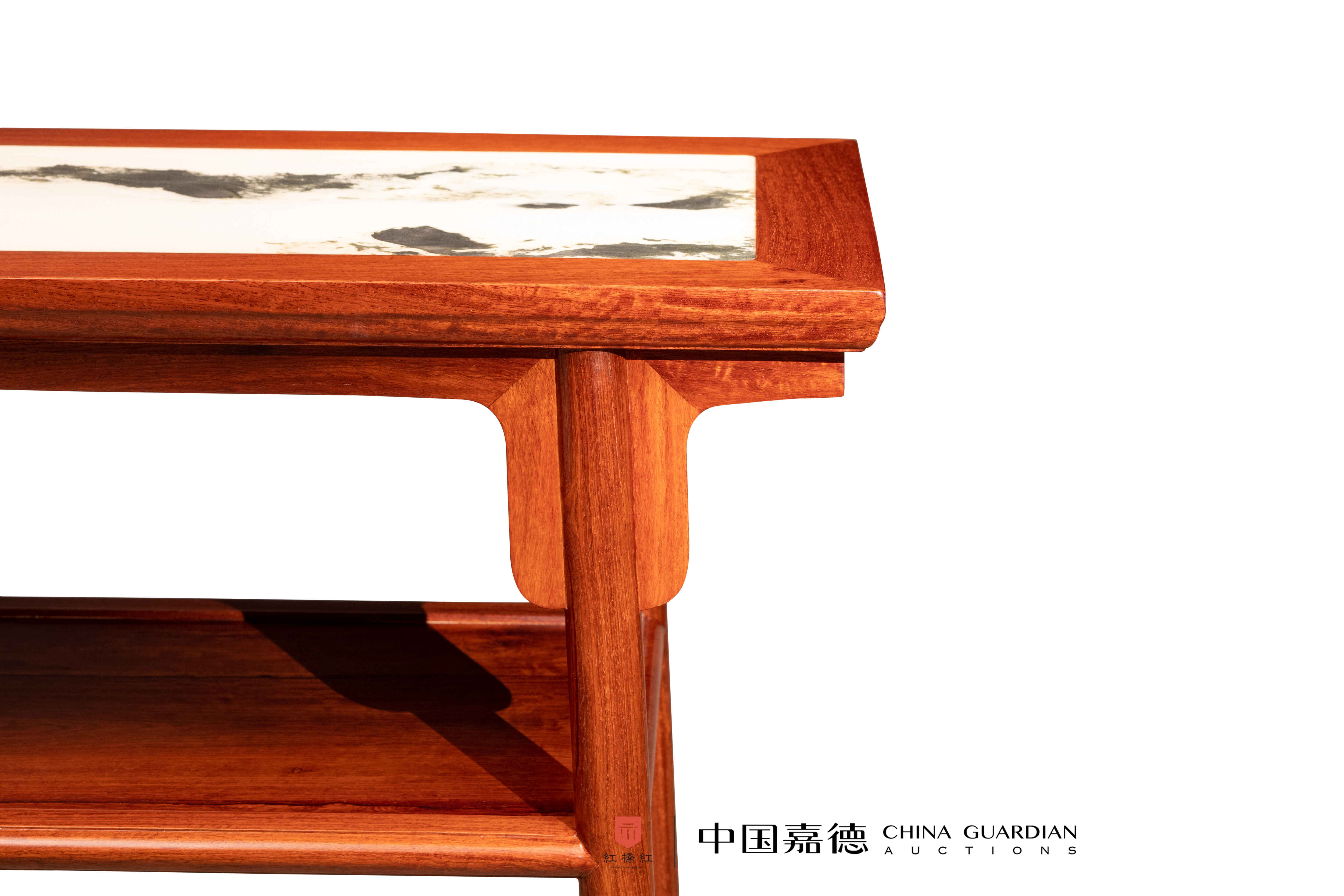 此案以缅甸花梨木制,纹理红润,清晰自然。案面格角榫攒边打槽装大理石,如同水墨山水。