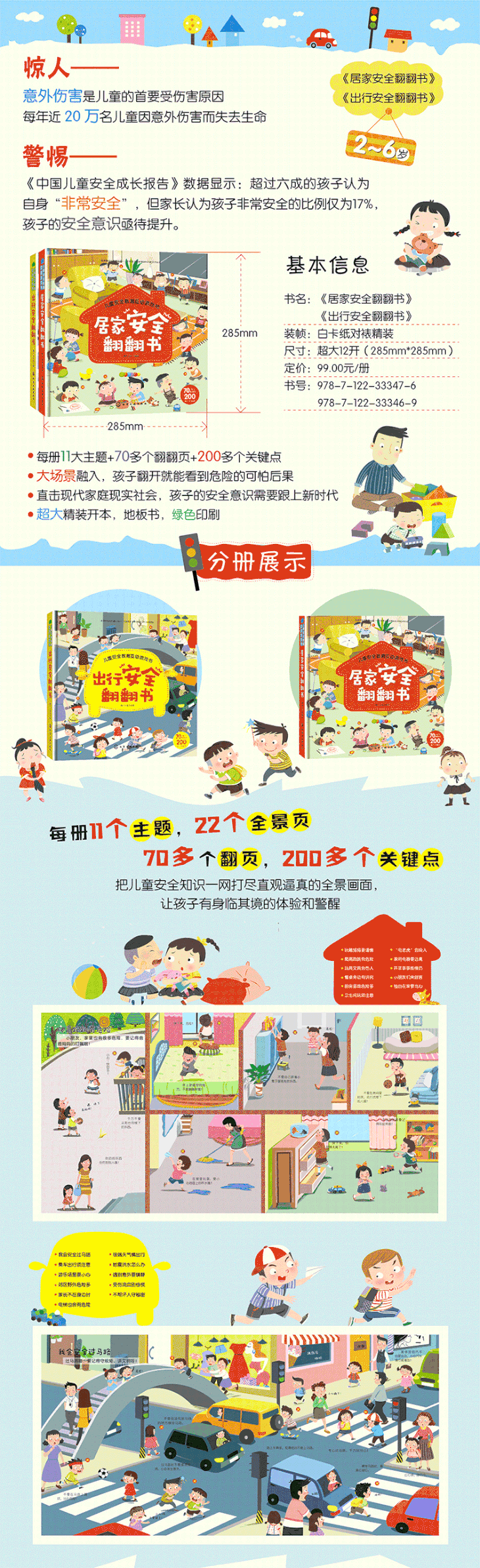 这是一套树立孩子安全意识的互动游戏书,书中围绕宝宝生活中容易发生危险的地方和高发安全问题,用简洁有趣的语言和趣味插图并通过翻翻等工艺形式,让儿童在互