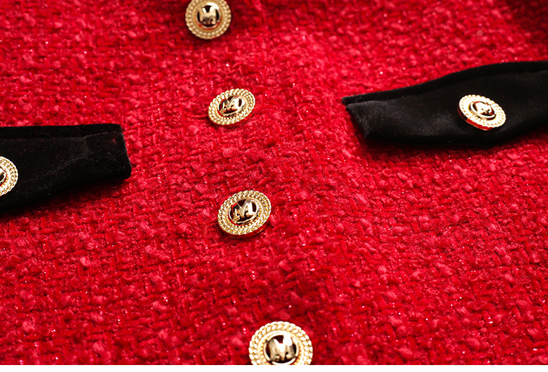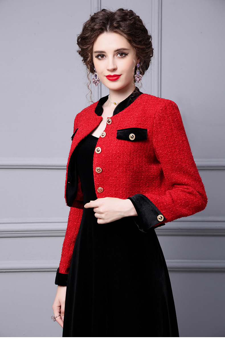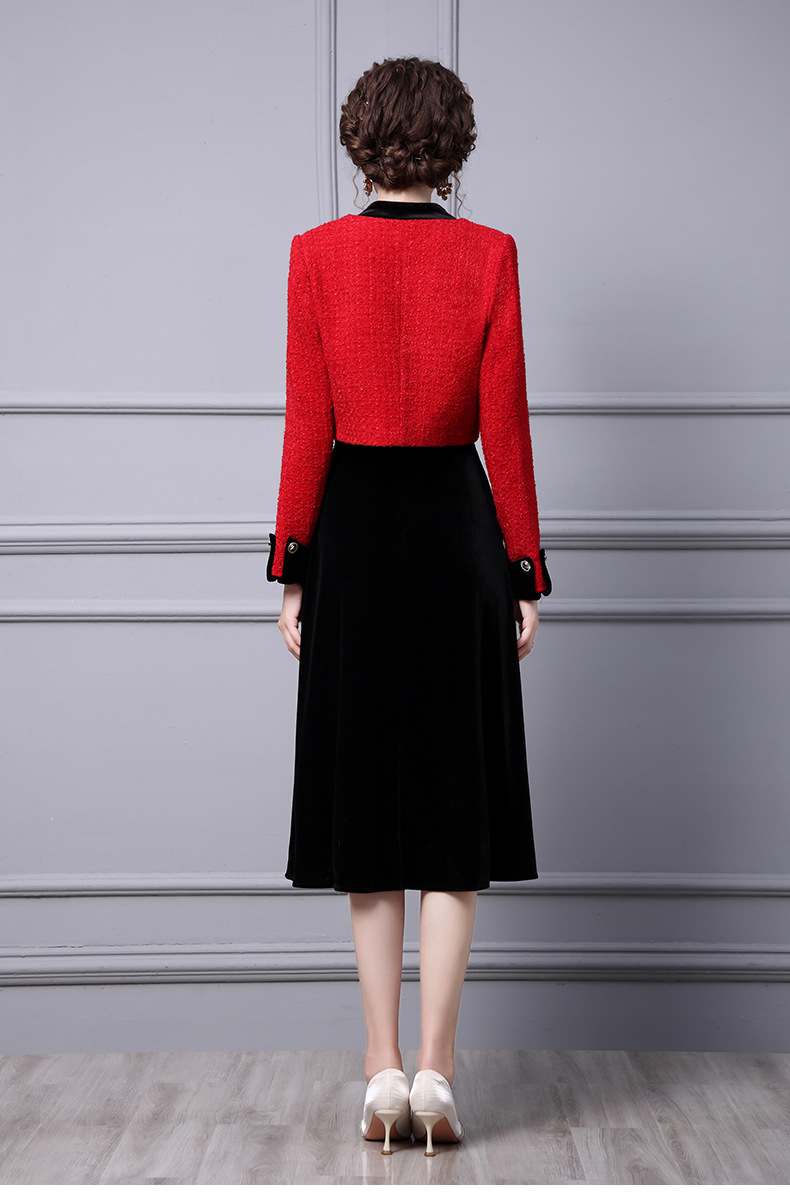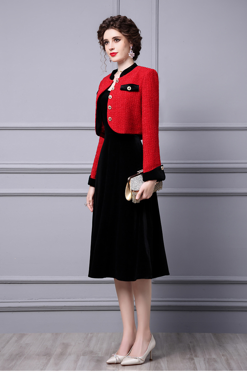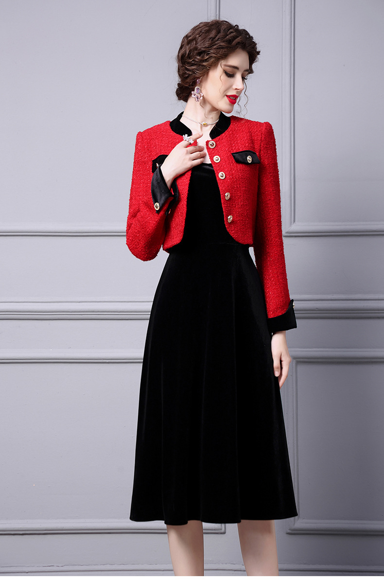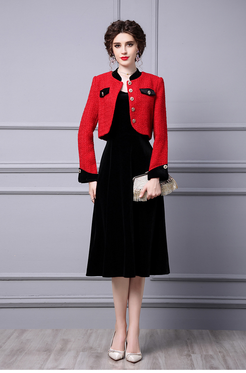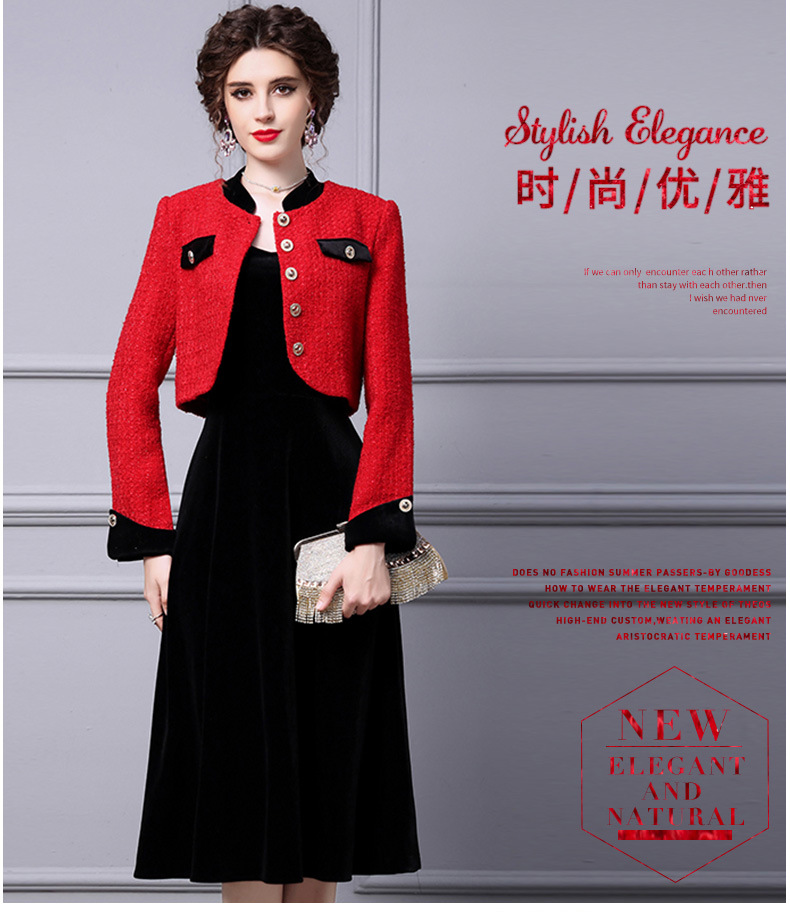 ZLFS-YY100新款时尚洋气毛呢外套金丝绒吊带裙两件套