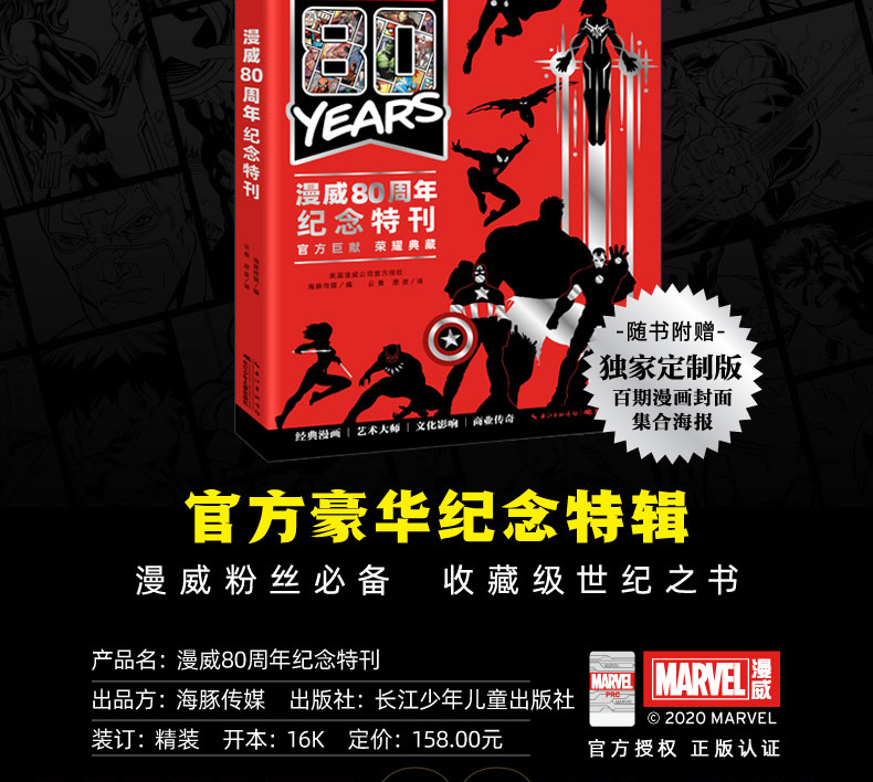 《漫威80周年纪念特刊》是漫威官方推出的一本漫威漫画80年发展历程的解析之书。全书按照年代的顺序,从“时代背景、漫画发展、角色创造、天才作者、文化影响”五个方面,详细叙述了1939年到2020年漫威漫画的发展之路。全书共八万字,内含经典漫画封面、创作者珍贵映像、角色形象设计等百张图片,是一本能让读者深度认识漫威的经典作品。