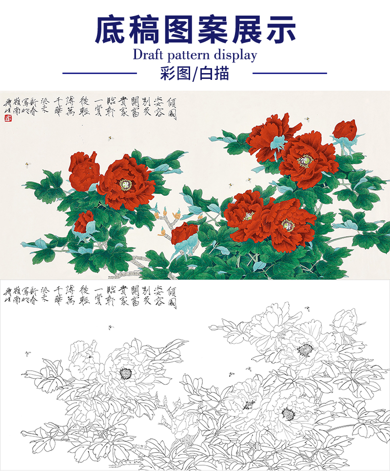 周彦生花鸟工笔画白描底稿《倾国姿容》横幅牡丹临摹勾线高清打印稿A671