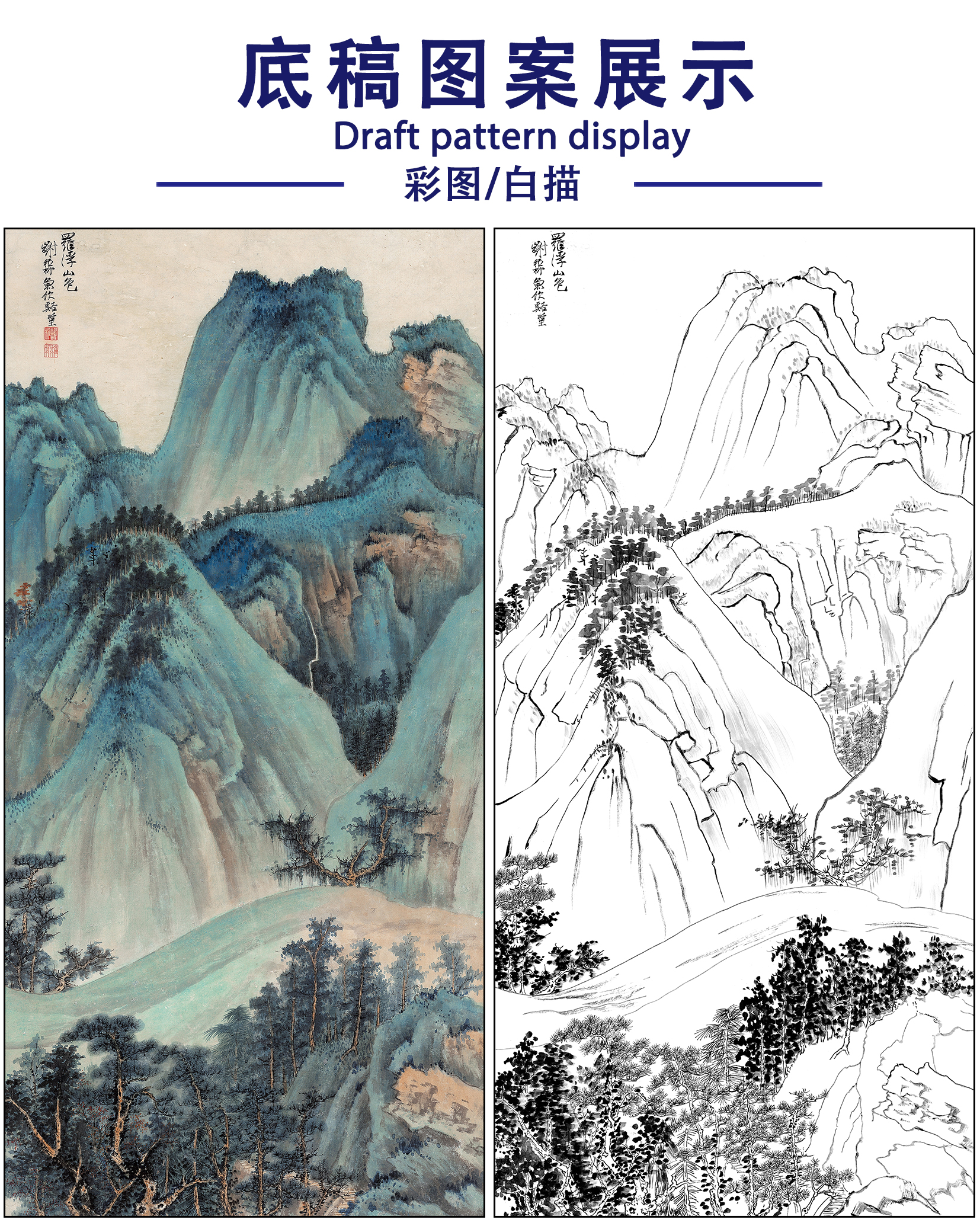谢稚柳山水工笔画白描底稿《罗浮山色》临摹勾线高清打印稿XZ38