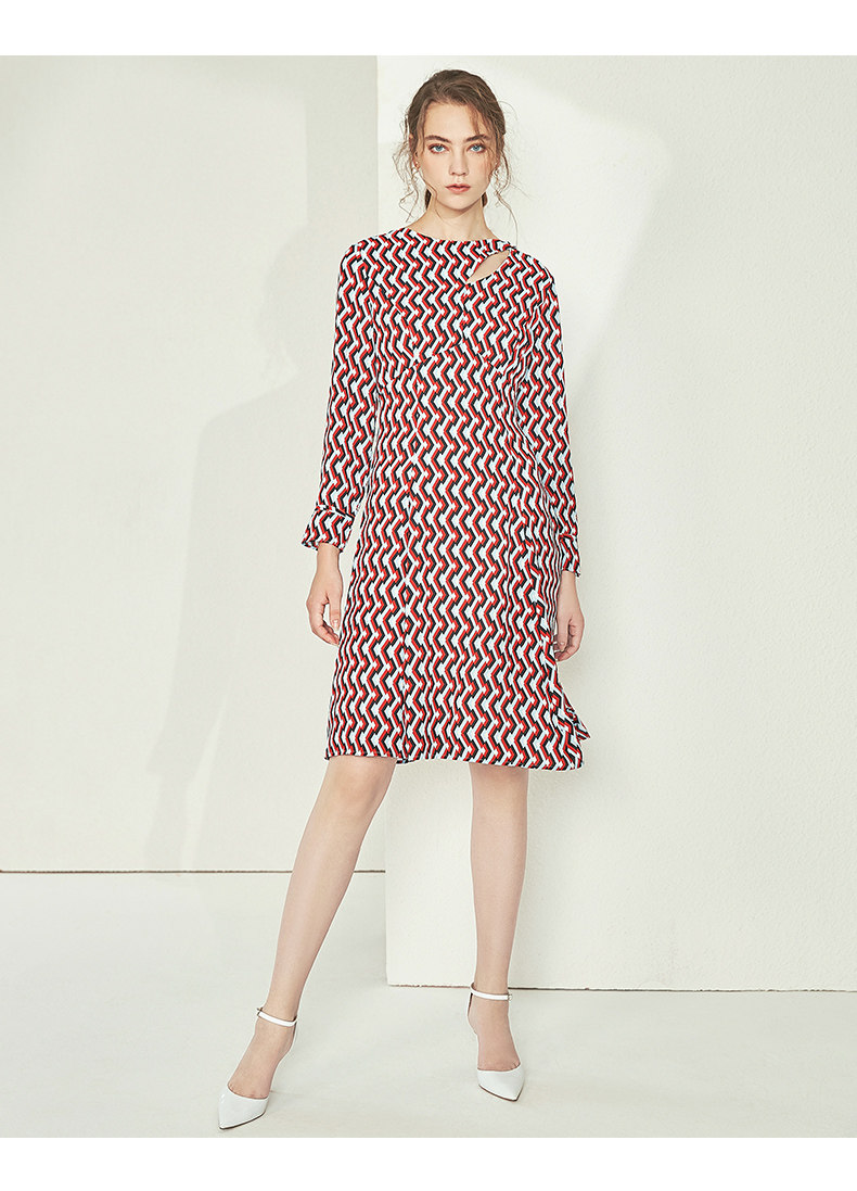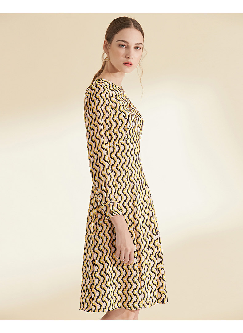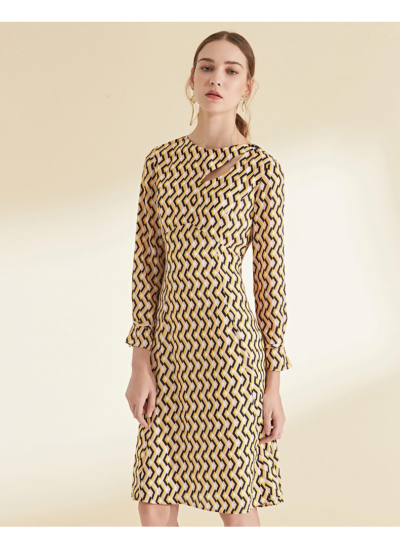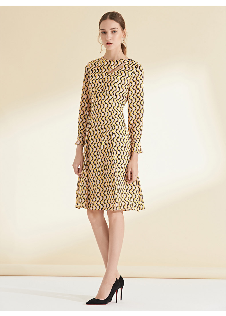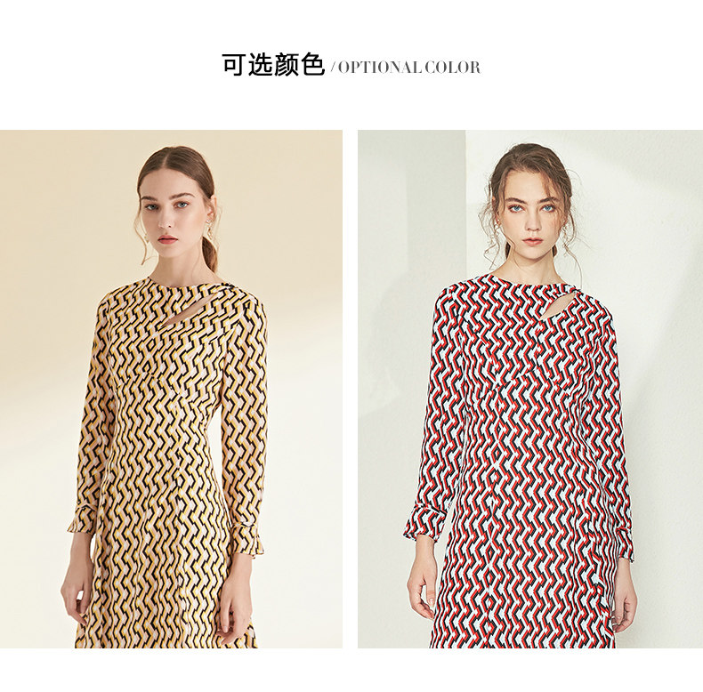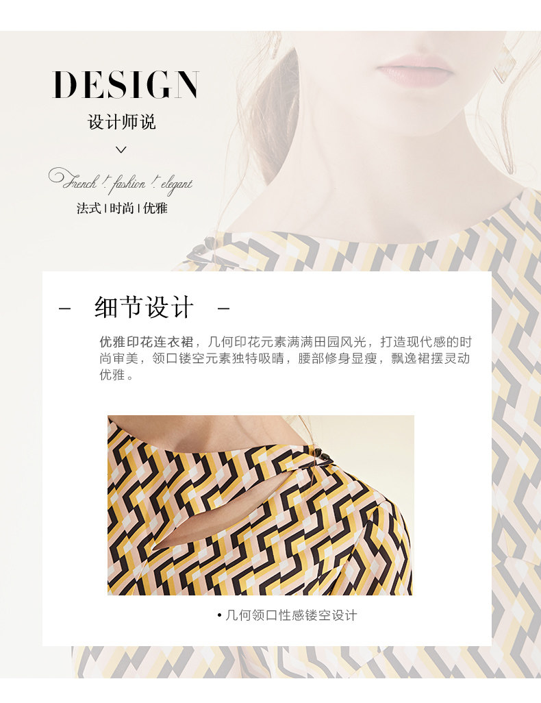 EITIE爱特爱女装初拼色长袖收腰显瘦优雅印花连衣裙6007707