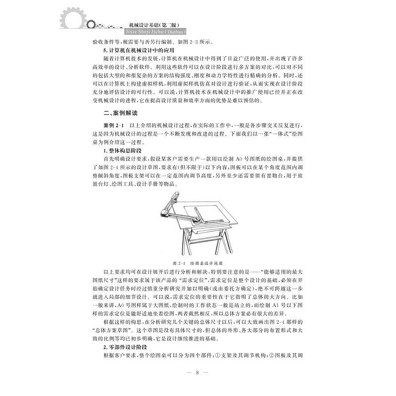 全书共14章,主要内容包括:绪论、平面机构的自由度、平面连杆机构、凸轮机构、间歇运动机构、齿轮传动、轮系、带传动与链传动、连接、滚动轴承、轴、联轴器、离合器、制动器。每章均有导入(含重难点)、正文、小结和一定数量的习题。为了便于学生自学,每一章均有导入(含重难点)、正文和小结。结尾将对所述内容进行了归纳和总结,并附有一定数量的习题。在编写方式上符合学生的认知规律和课程的教学规律,注重学生综合设计能力的熏陶与培养,使学生能初步掌握、了解机械设计的整个过程。书中各章附有思考题和习题,例题、思考题、习题的选择均注意与工程应用背景相结合。