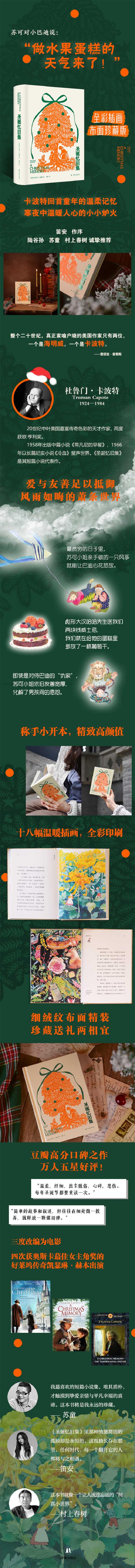 《圣诞忆旧集》是美国作家卡波特回忆童年往事的短篇故事集,作为当代文学典被收入“现代文库”丛书,是多年来人们在节日互赠的礼物。曾三度被改编为电影,由好莱坞传奇凯瑟琳·赫本出演。