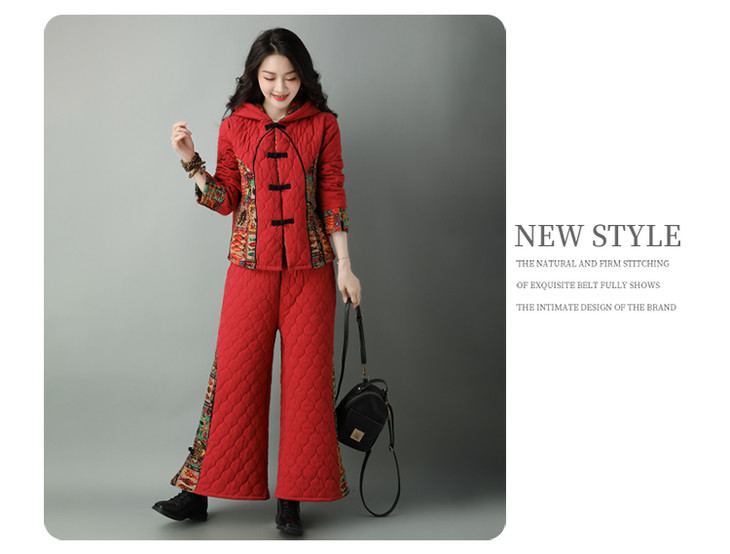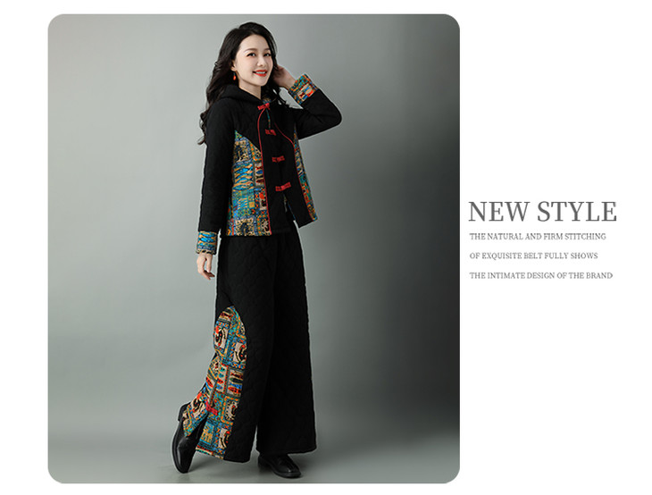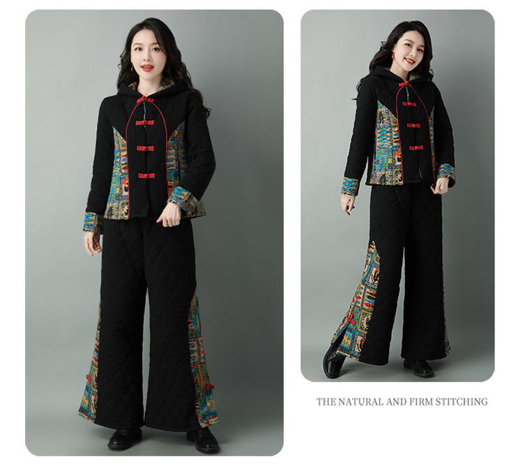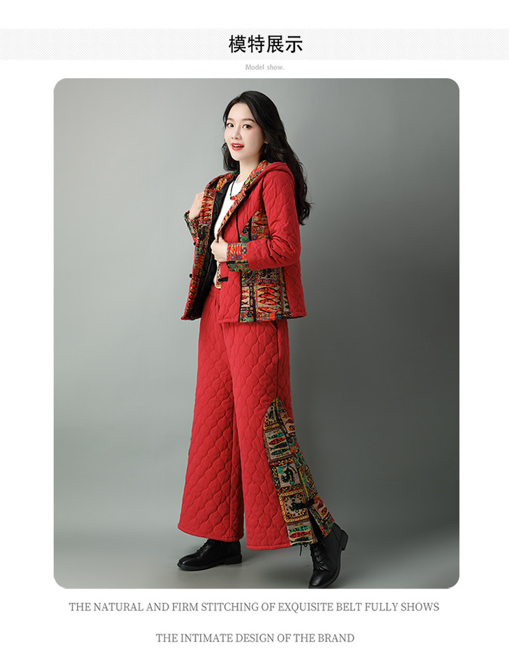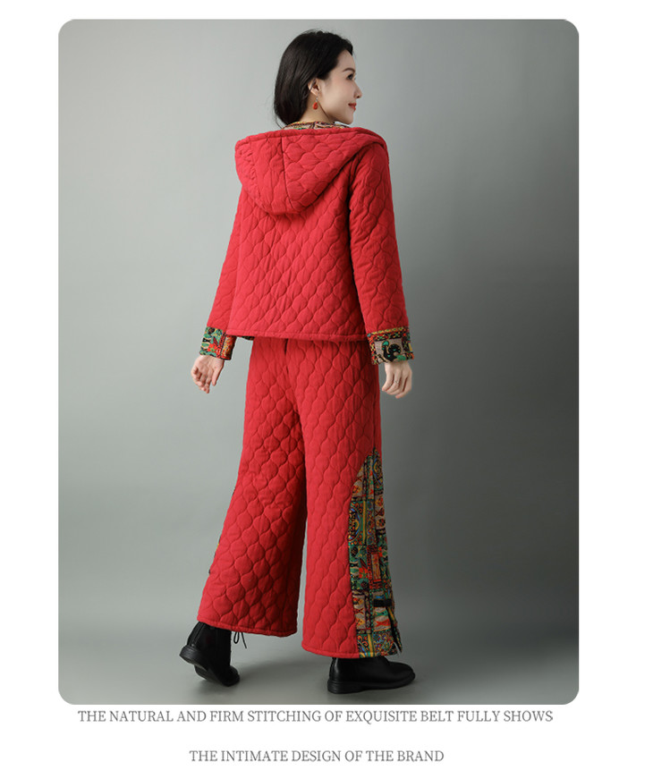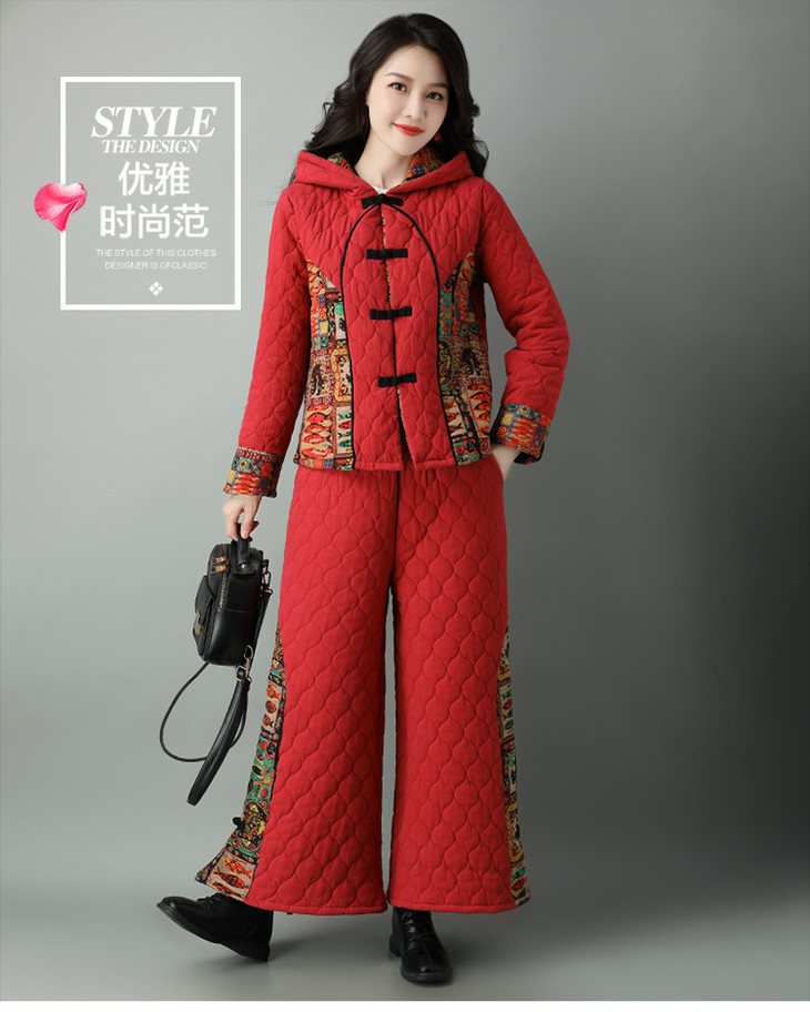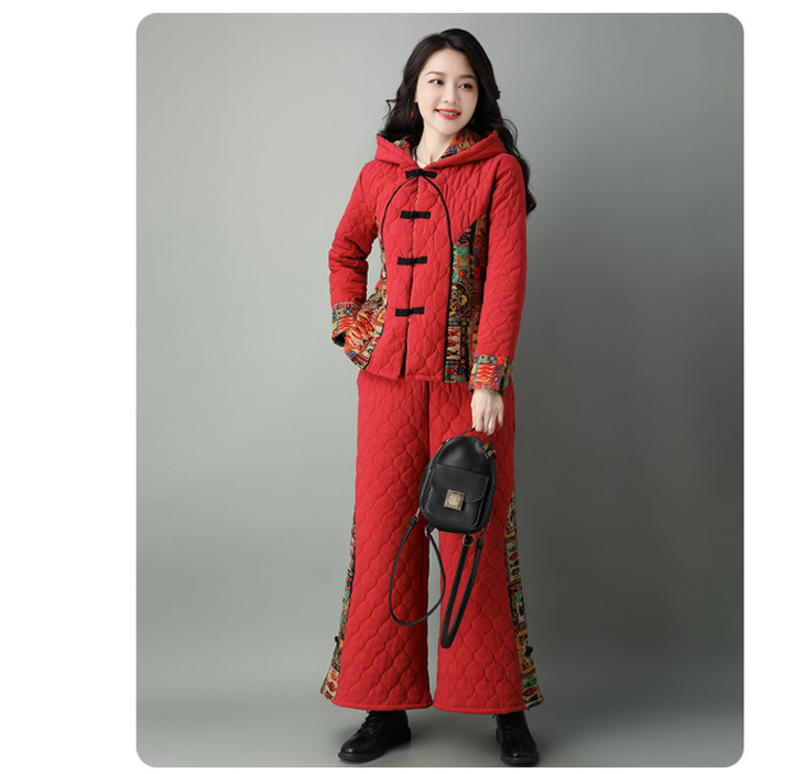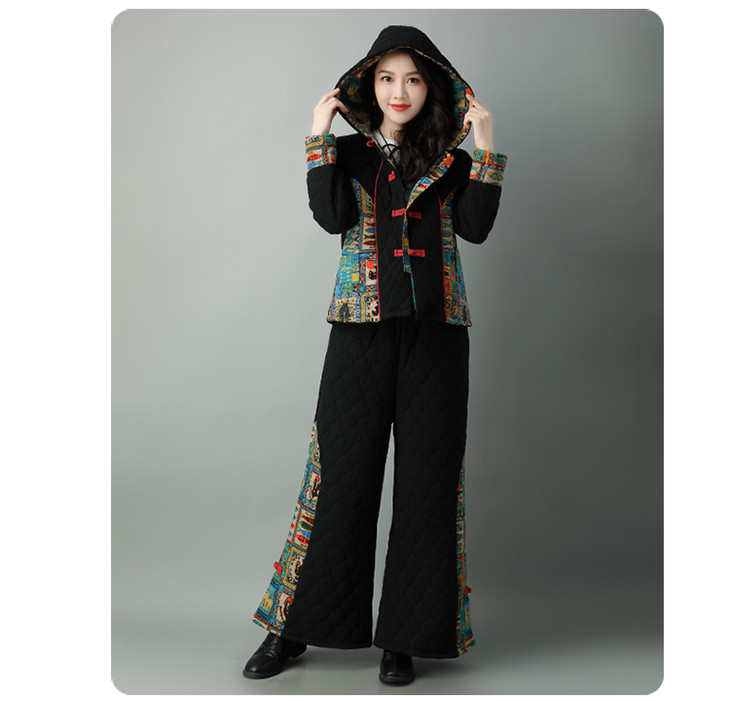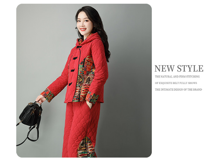 民族风棉麻加厚套装女冬装新款盘扣复古连帽外套中老年棉服