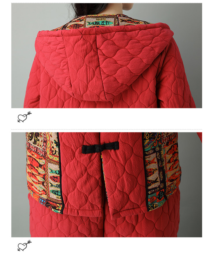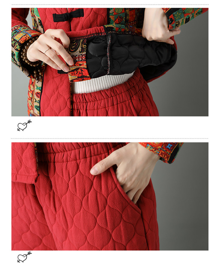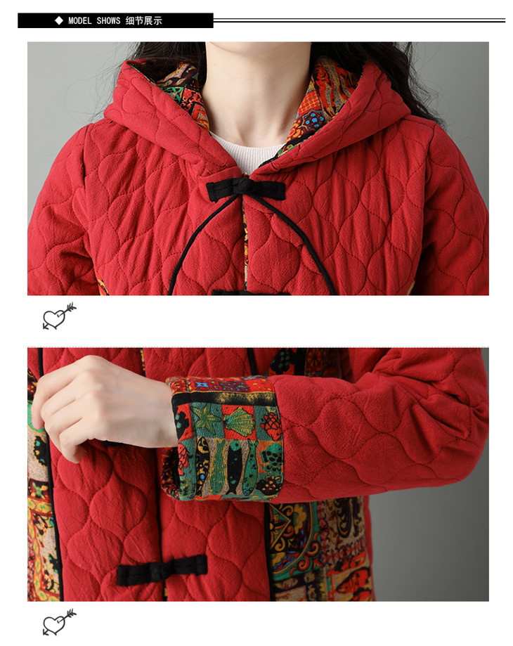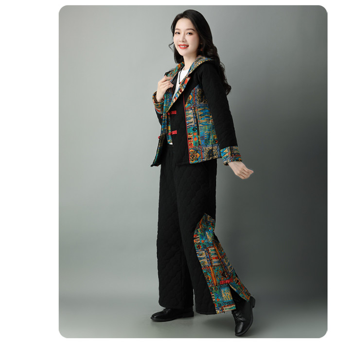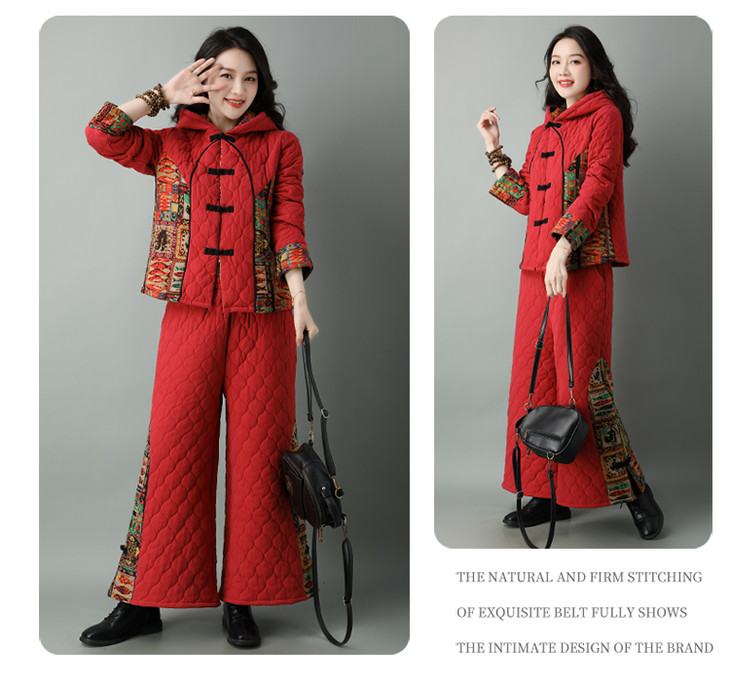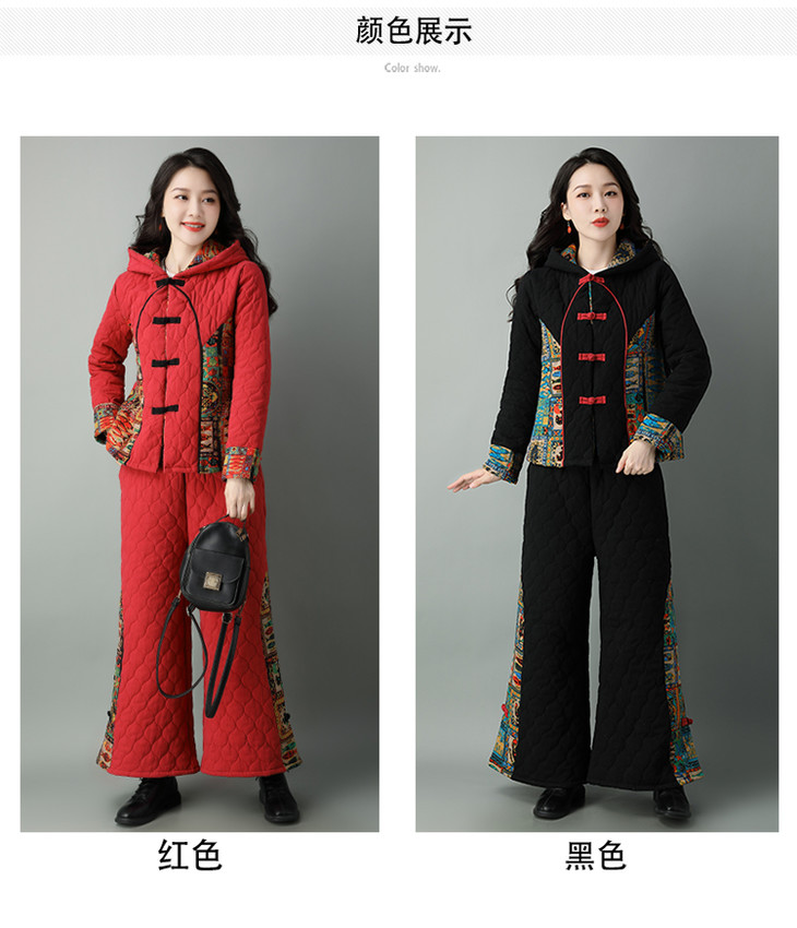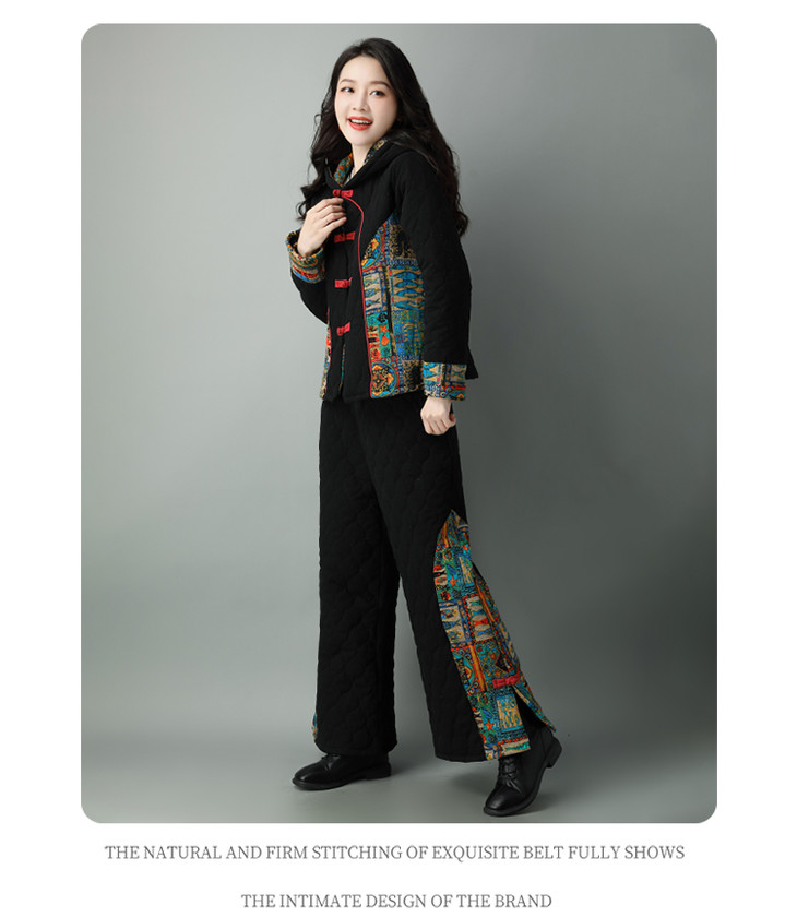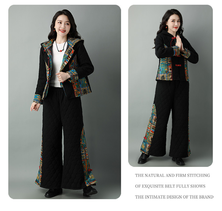 民族风棉麻加厚套装女冬装新款盘扣复古连帽外套中老年棉服
