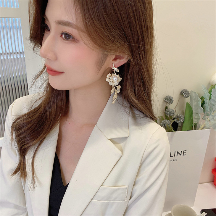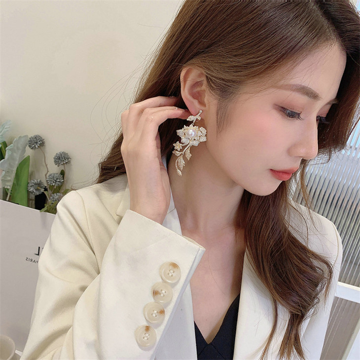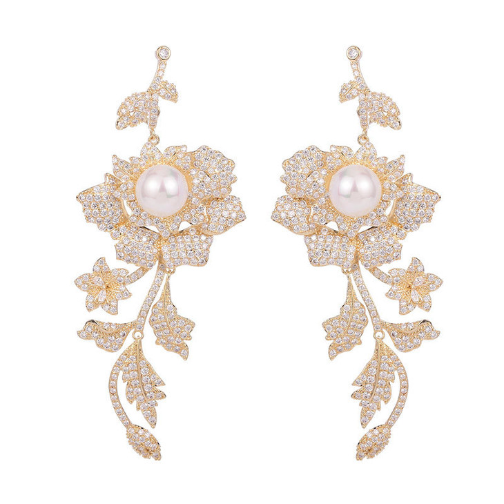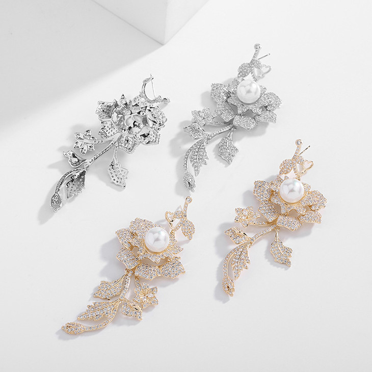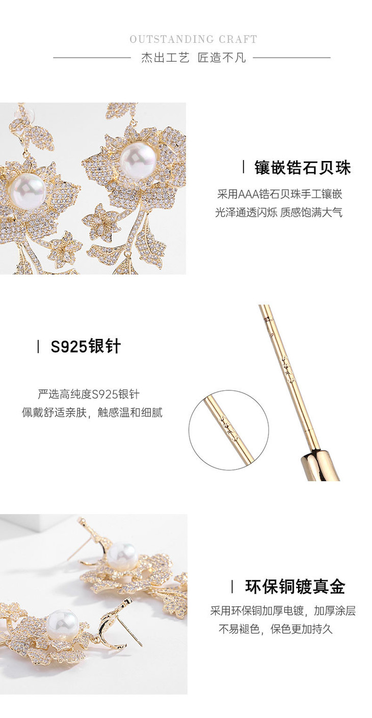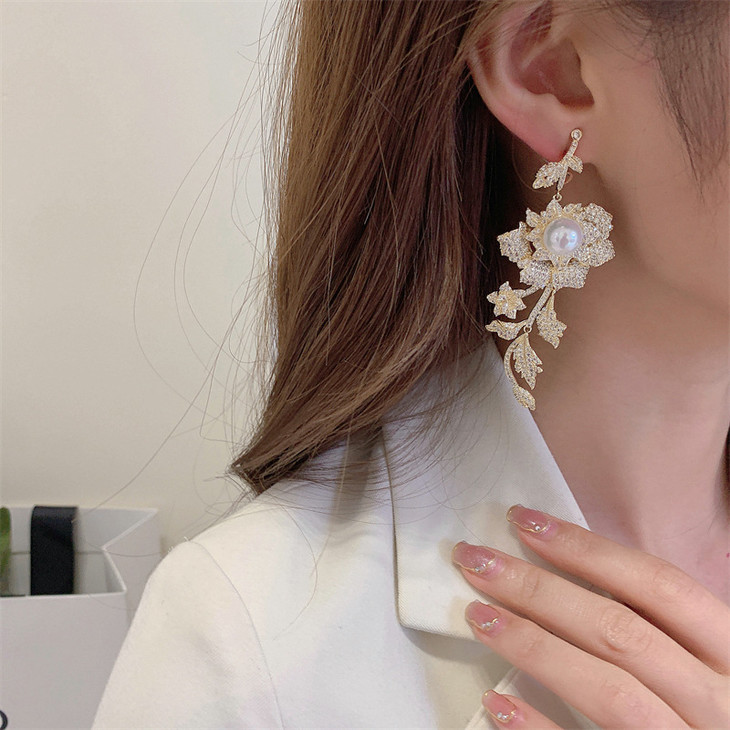 G-007轻奢锆石珍珠玫瑰花耳环名媛气质夸张大气耳坠晚宴礼服搭配耳饰
