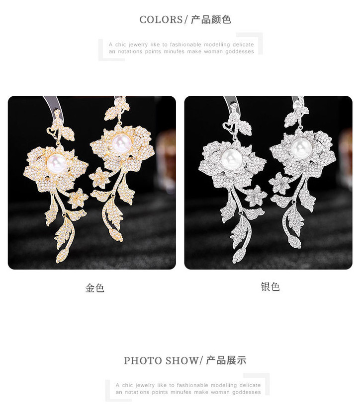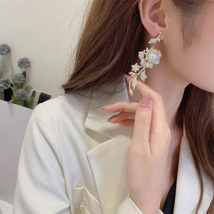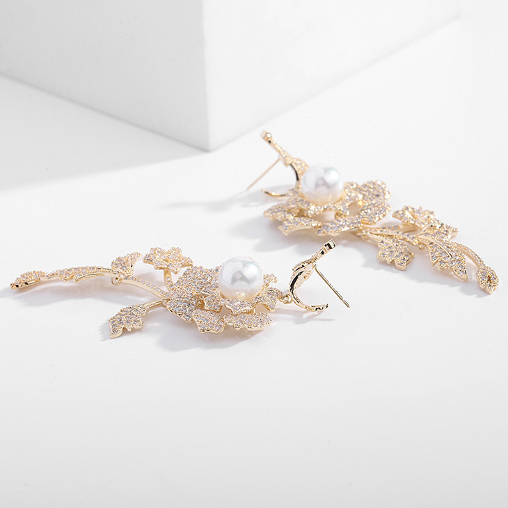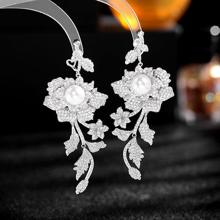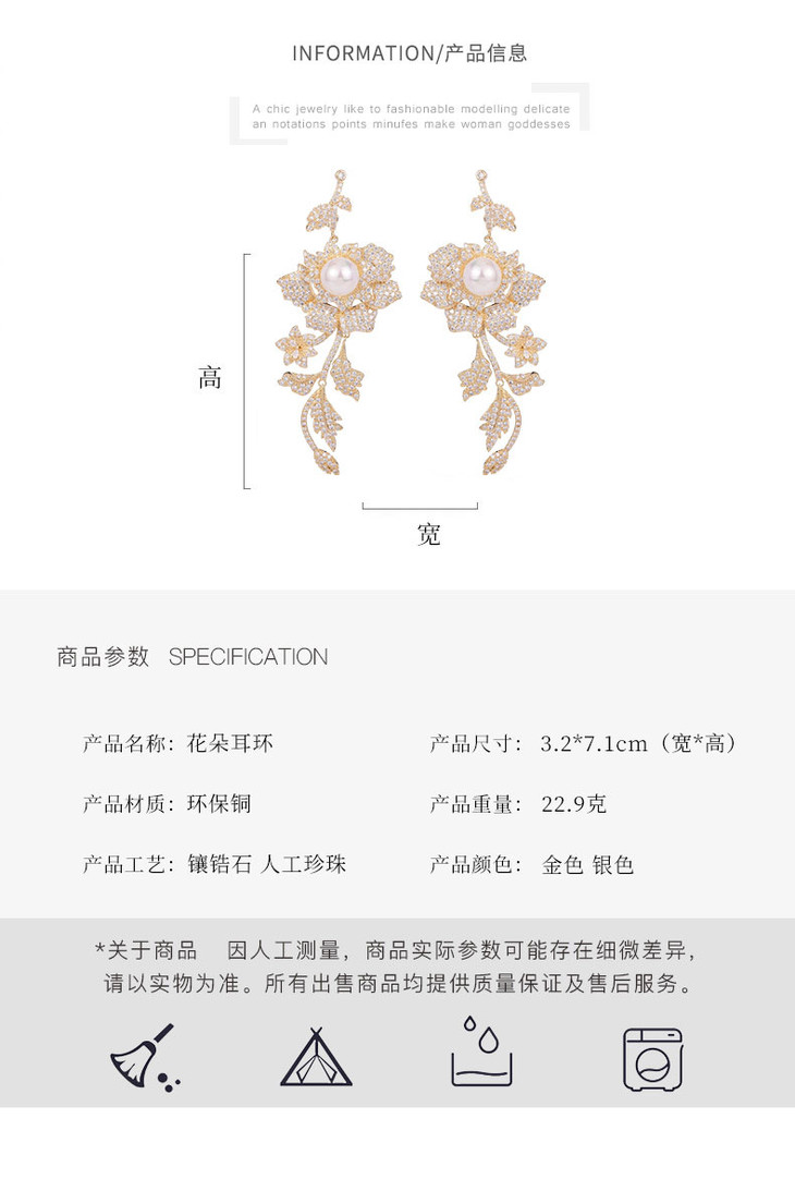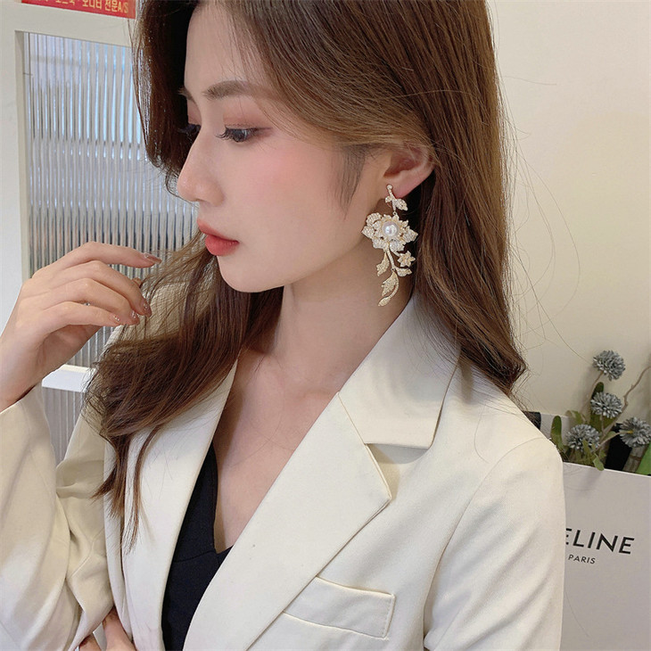 G-007轻奢锆石珍珠玫瑰花耳环名媛气质夸张大气耳坠晚宴礼服搭配耳饰