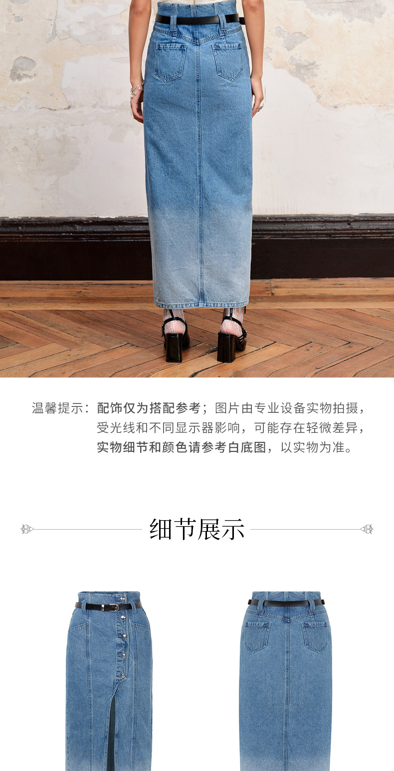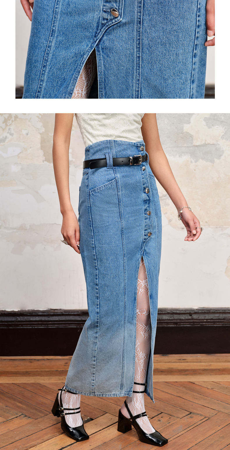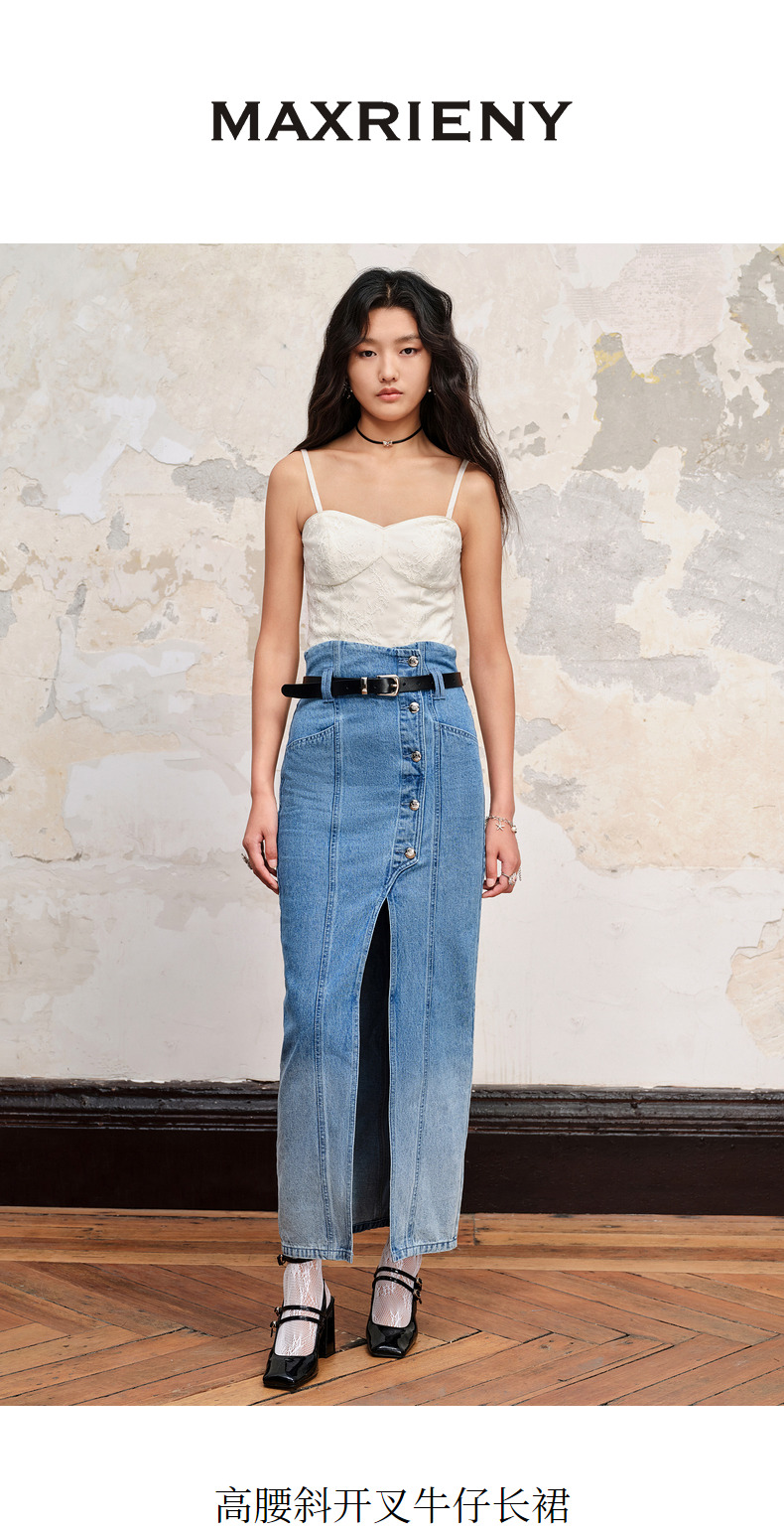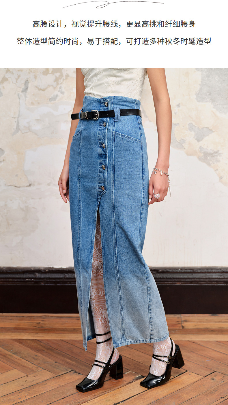 MAXRIENY高腰斜开叉牛仔长裙早秋小众设计感半裙(货号:MC88SK613)