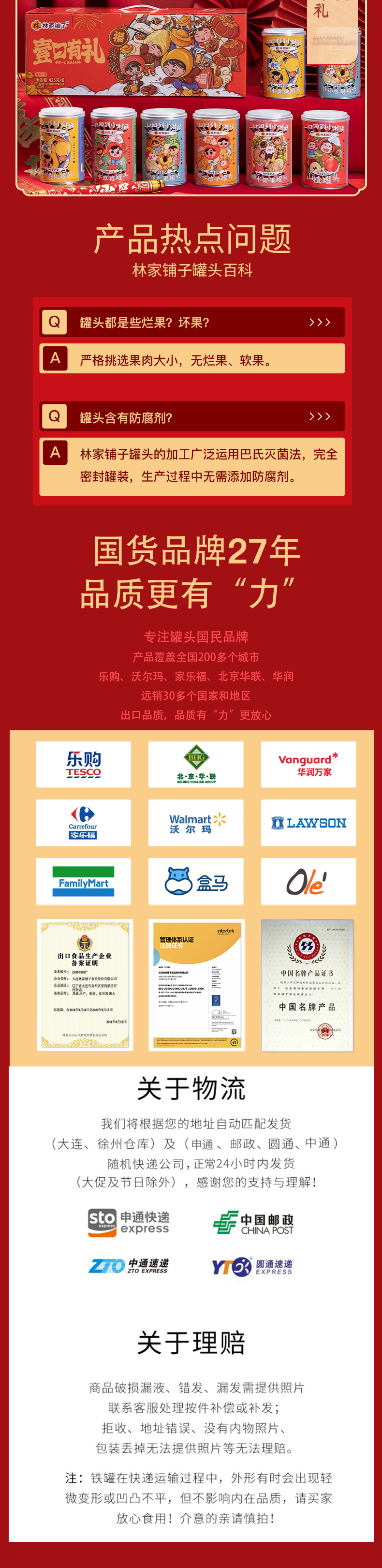 | 【品名】林家铺子壹口有礼黄桃罐头/大朵银耳羹罐头礼盒 【规格】 【保质期】24个月 【储存方法】常温保存,开封后需冷藏 【产地】大连/徐州 【发货地】大连/徐州 【发货快递】中通、圆通、邮政、极兔、顺丰等随机发 【不发货区域】新疆,西藏,港澳台地区不发 【发货时效】48小时,节假日顺延 |