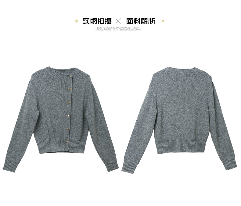 秋季新款灰色针织开衫女圆领斜扣设计感小众短款修身显瘦毛衣外套