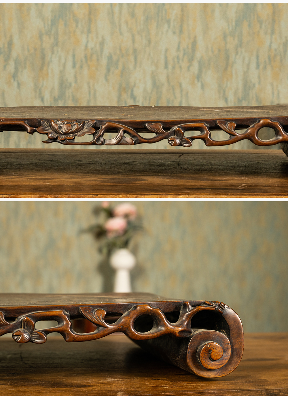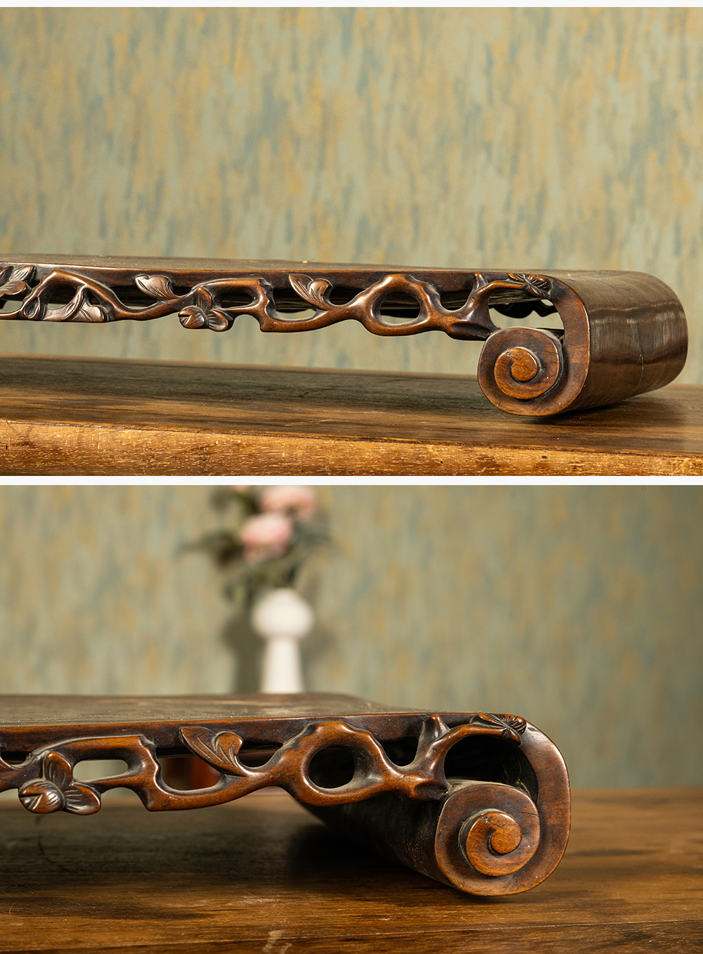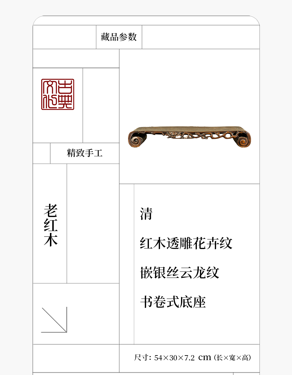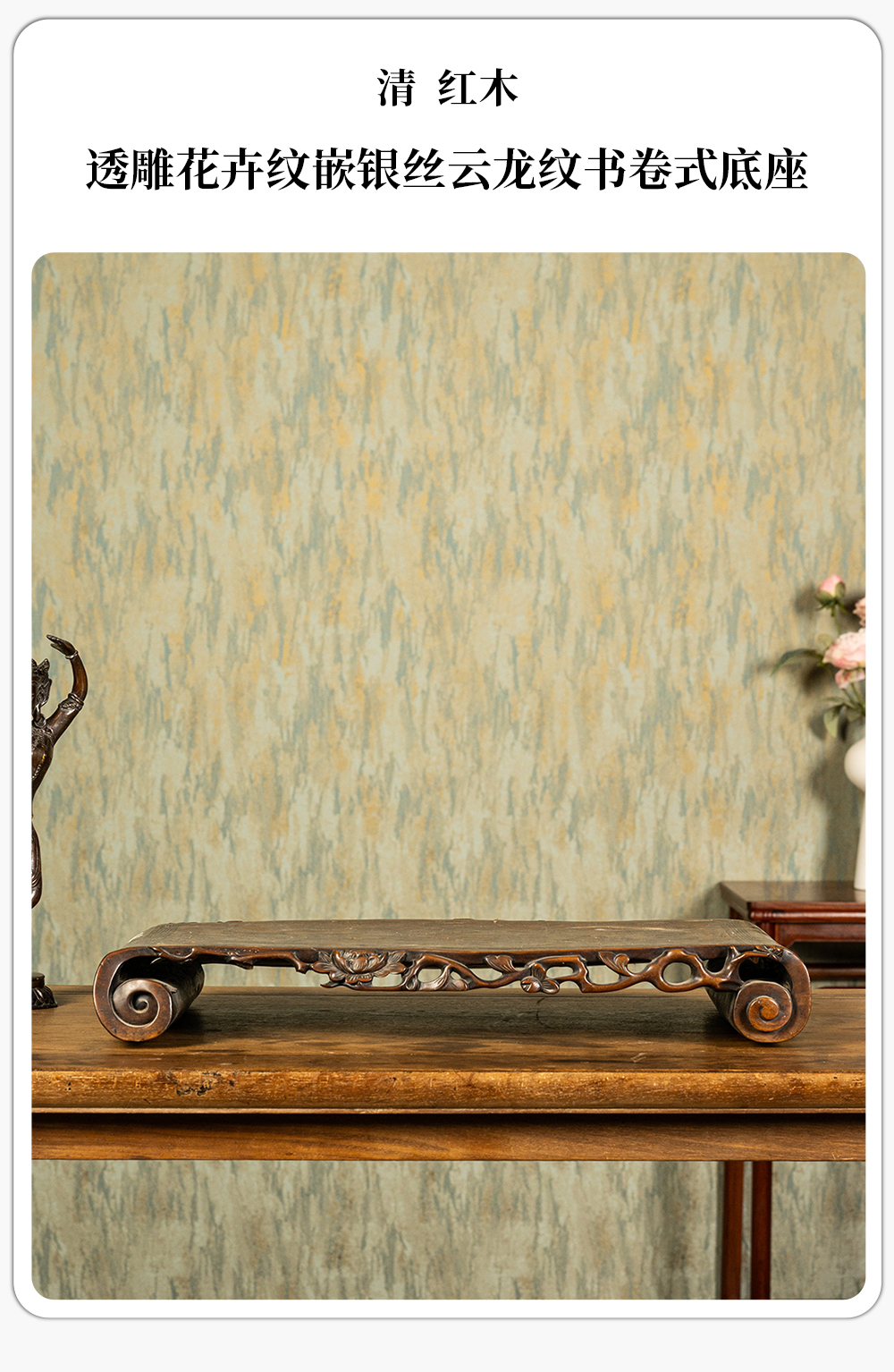 清 红木透雕花卉纹嵌银丝云龙纹书卷式底座