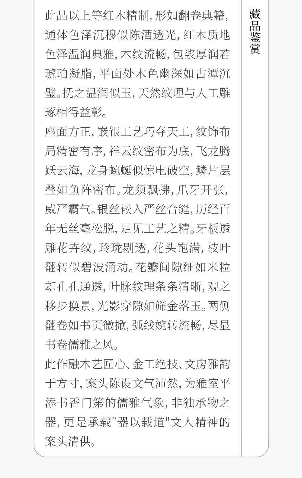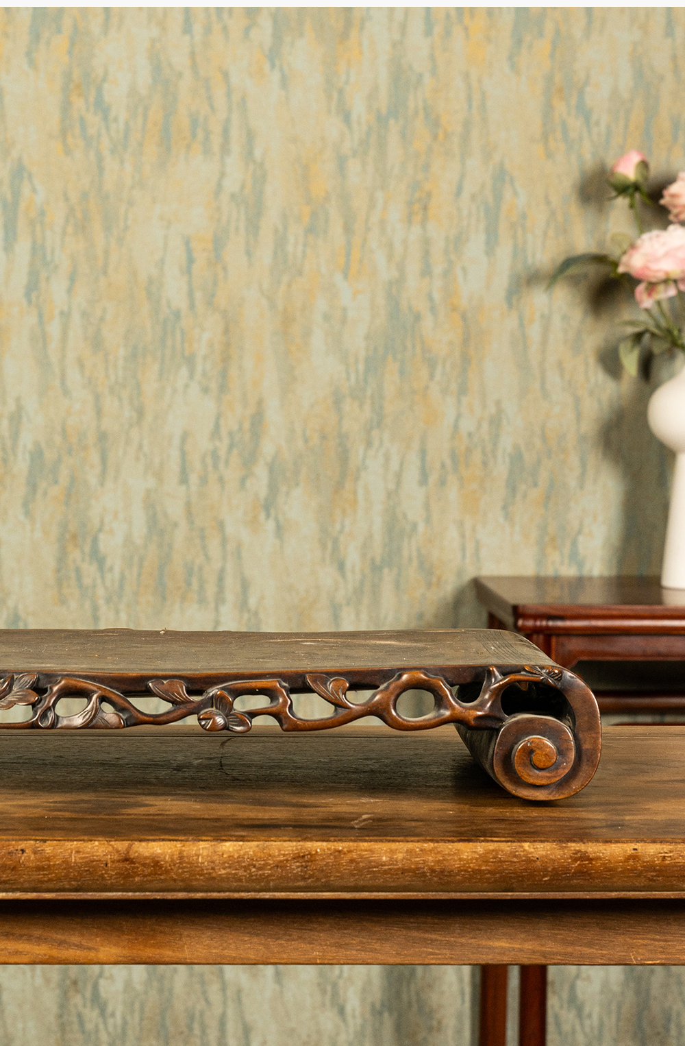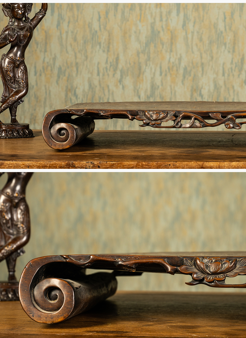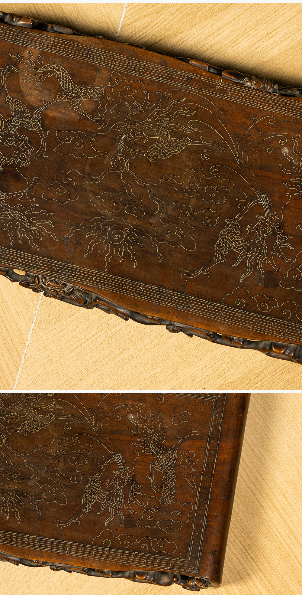 清 红木透雕花卉纹嵌银丝云龙纹书卷式底座