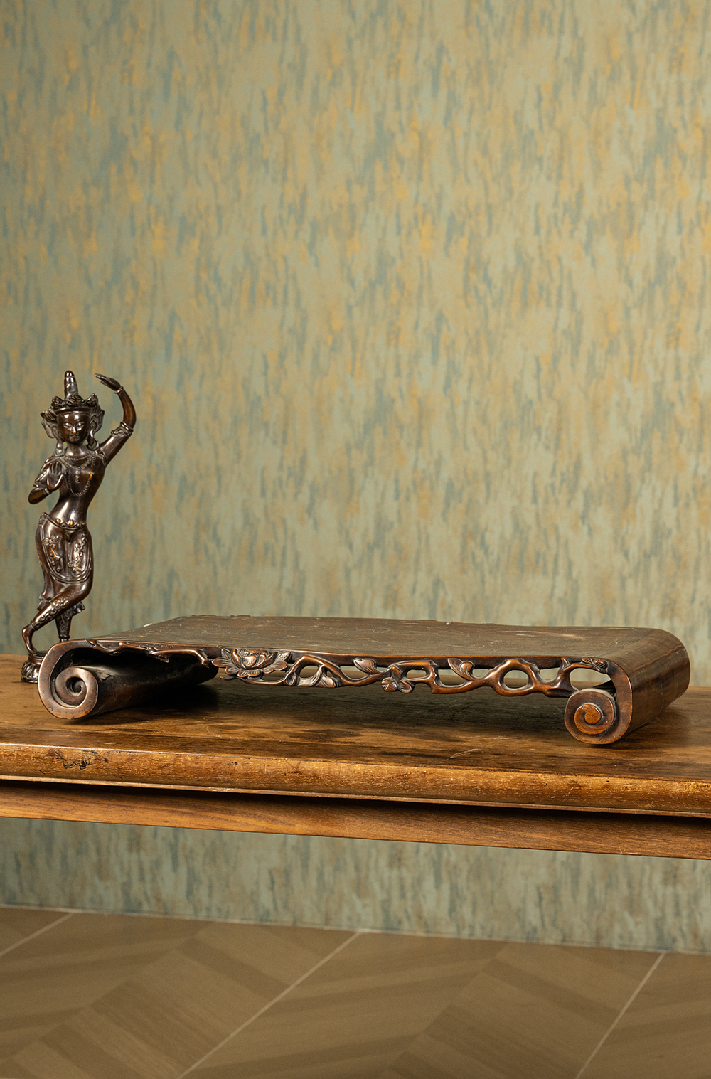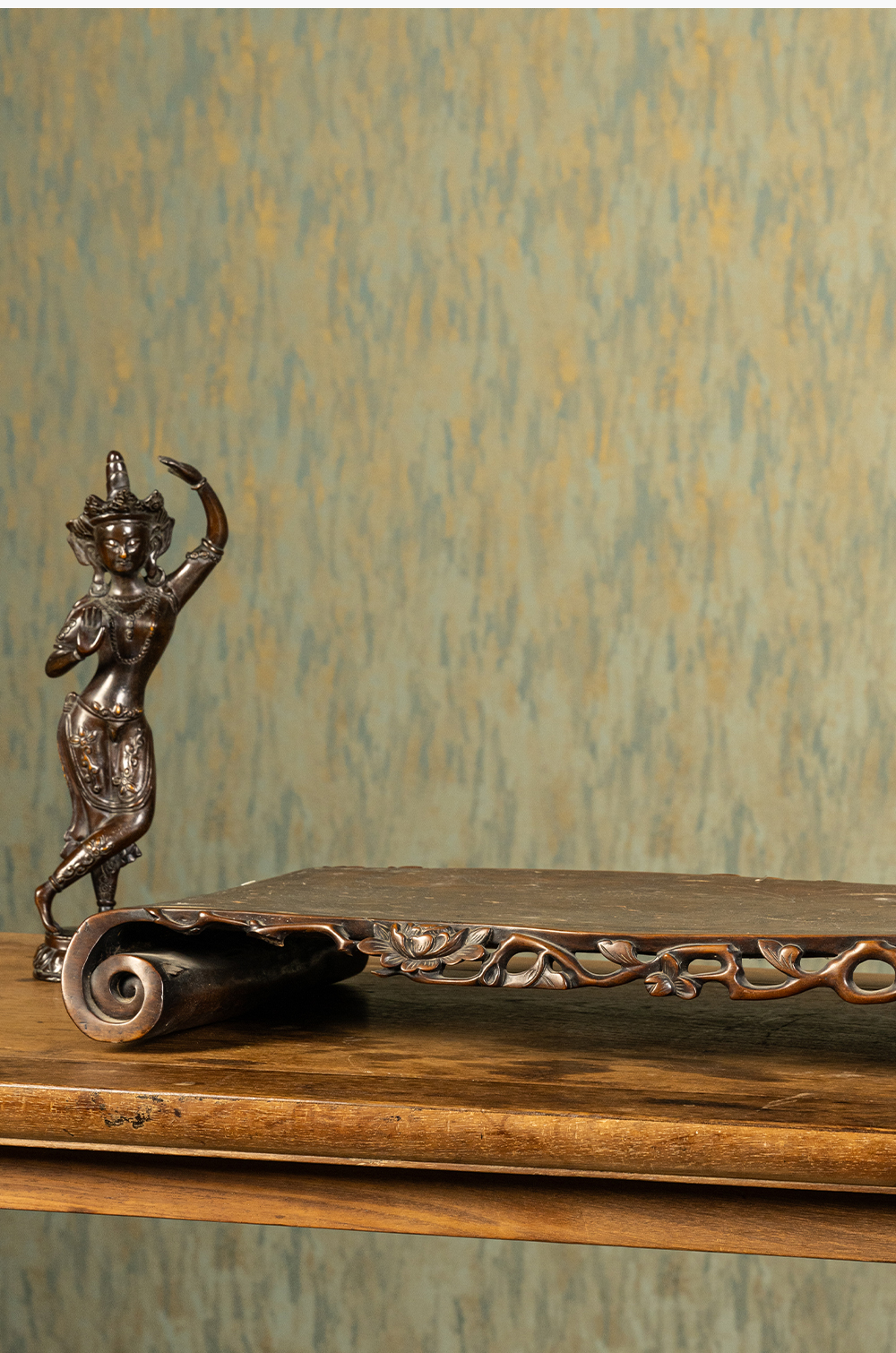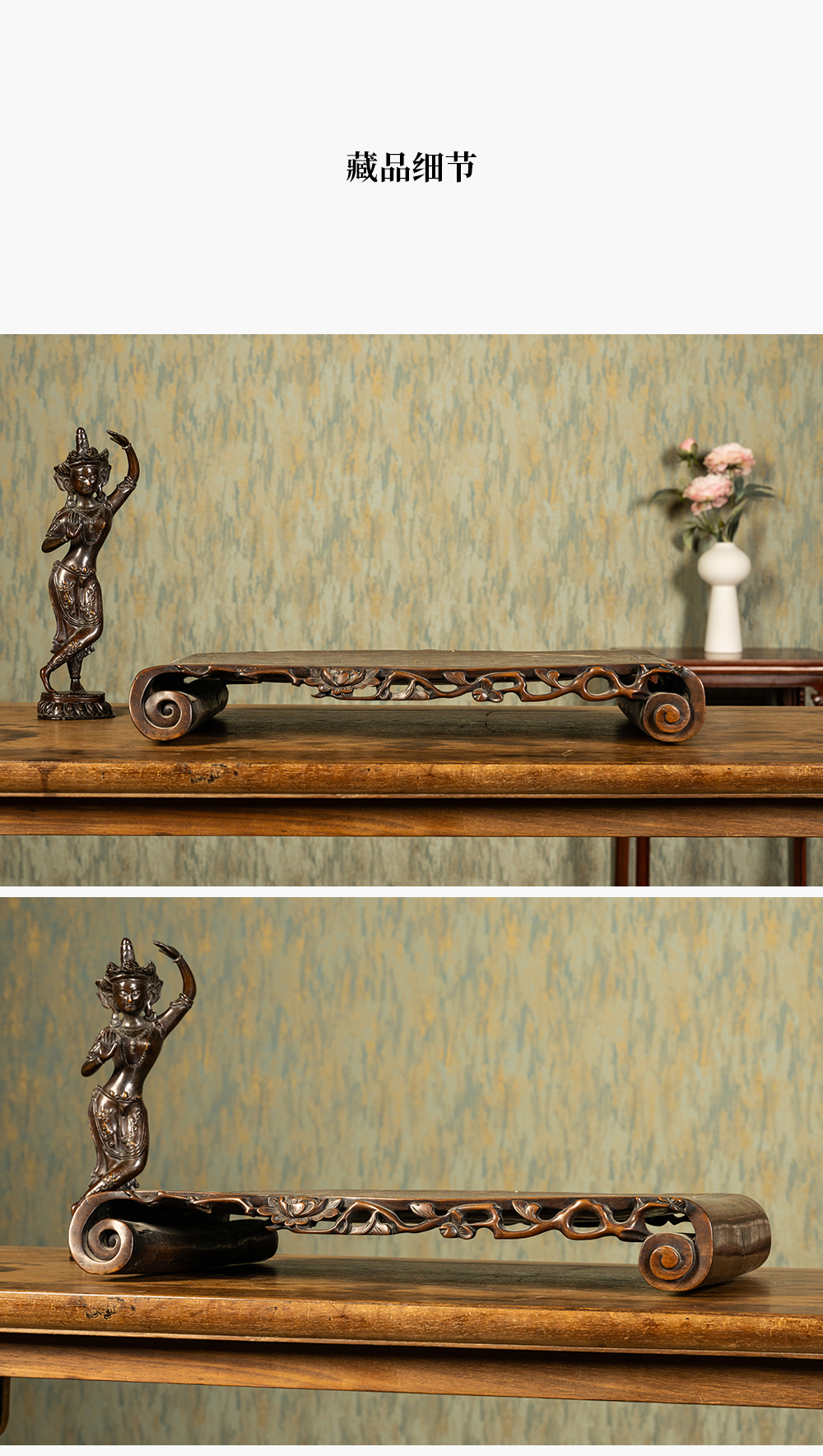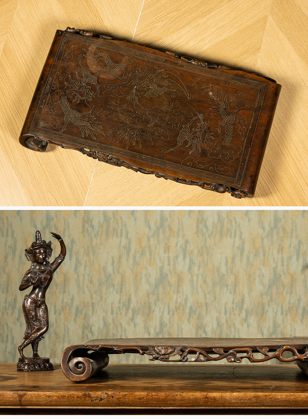 清 红木透雕花卉纹嵌银丝云龙纹书卷式底座