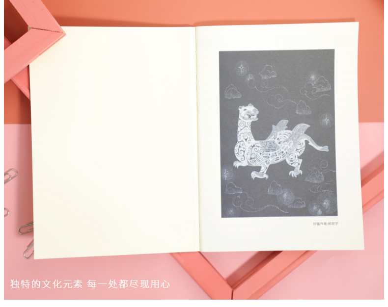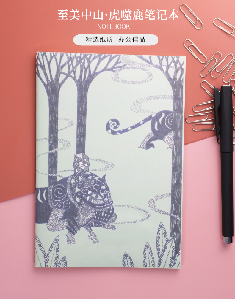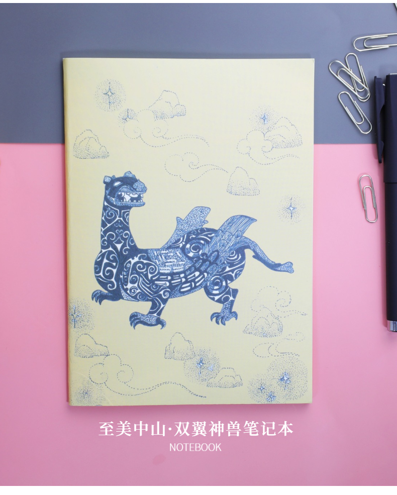 笔记本封面以铁足大铜鼎、十五连盏灯、错金银虎噬鹿屏座、双翼神兽造型为创作源泉