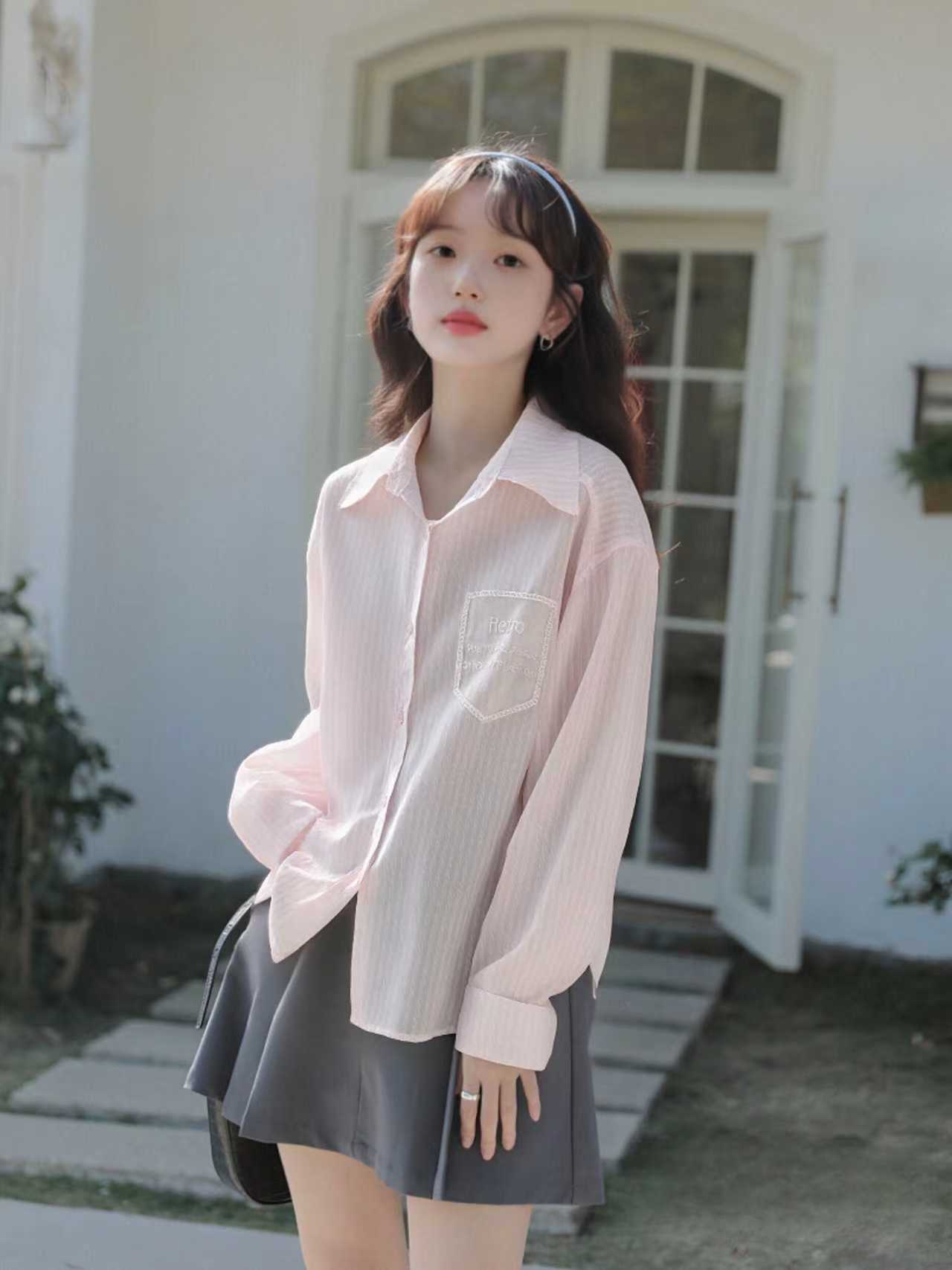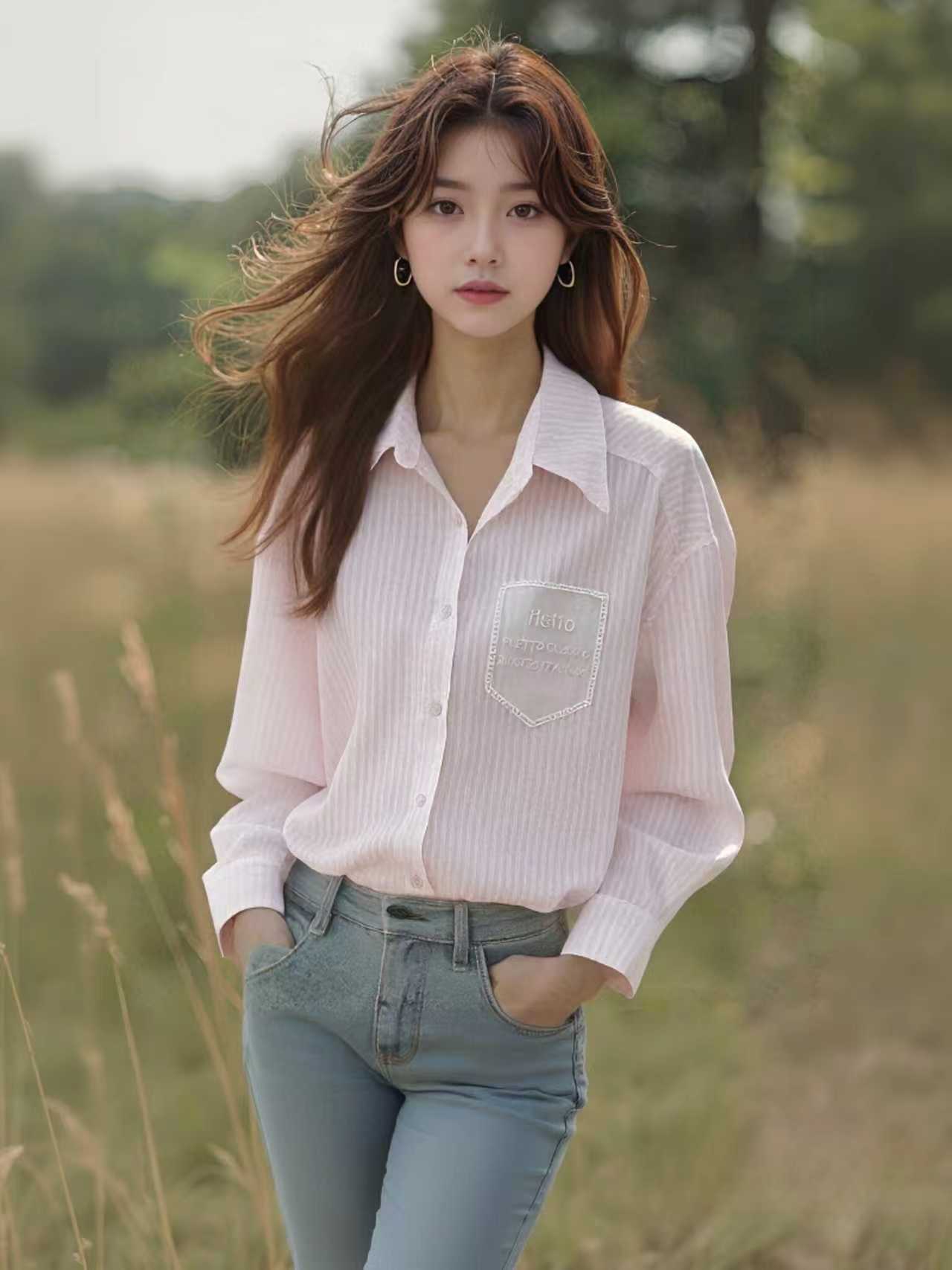 【秋新品】维纳真蒂2950清新条纹蕾丝口袋衬衫-喜出