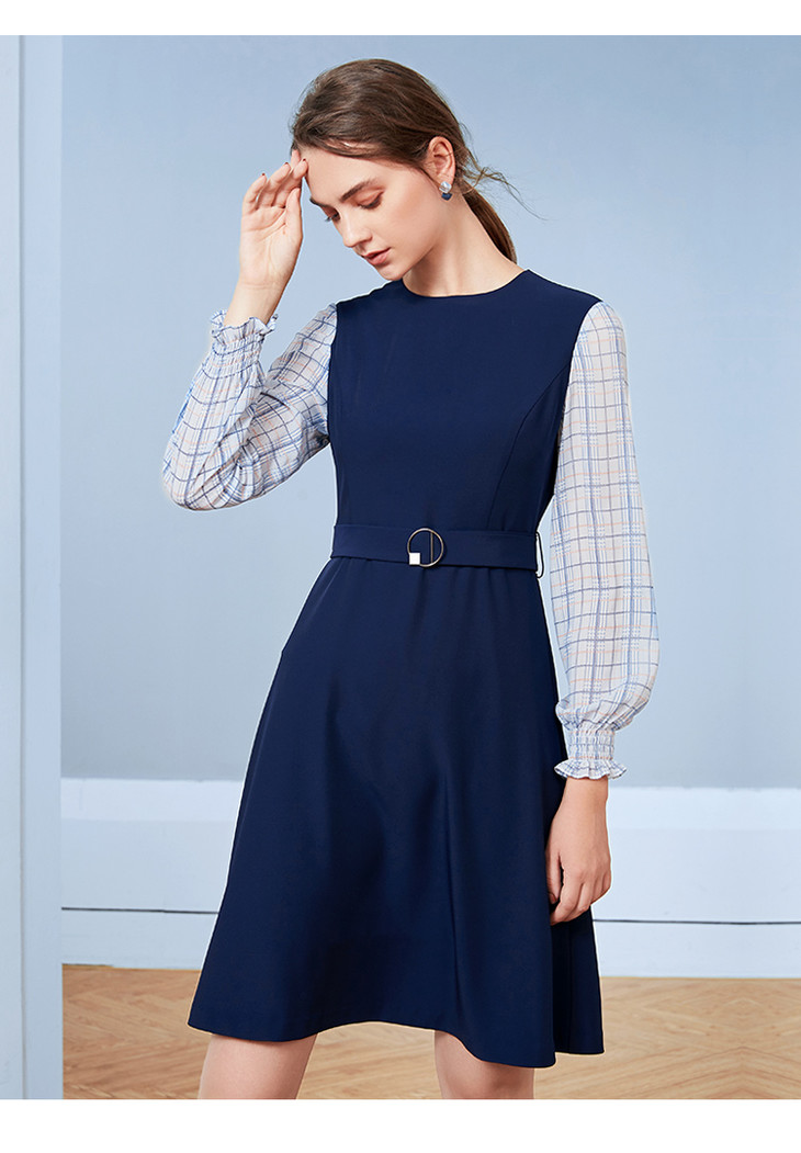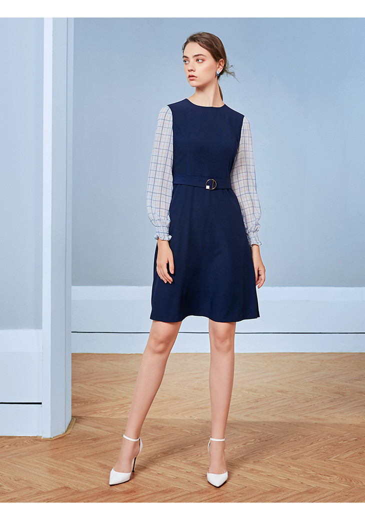EITIE爱特爱秋季新款气质通勤格纹拼接收腰显瘦A摆连衣裙女裙C20075104