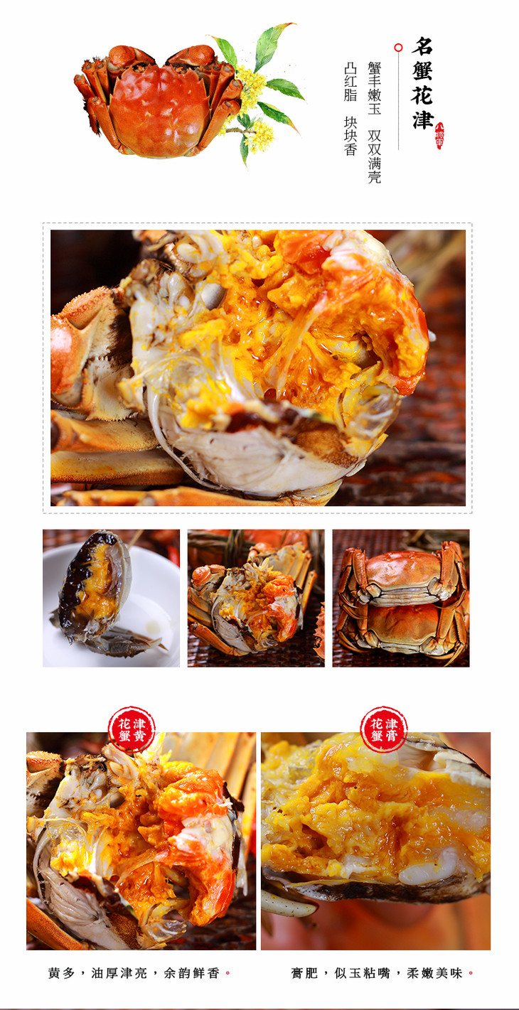 经典版:母蟹和公蟹各6只,母蟹:2.0~2.4两,公蟹:2.3~2.8两;