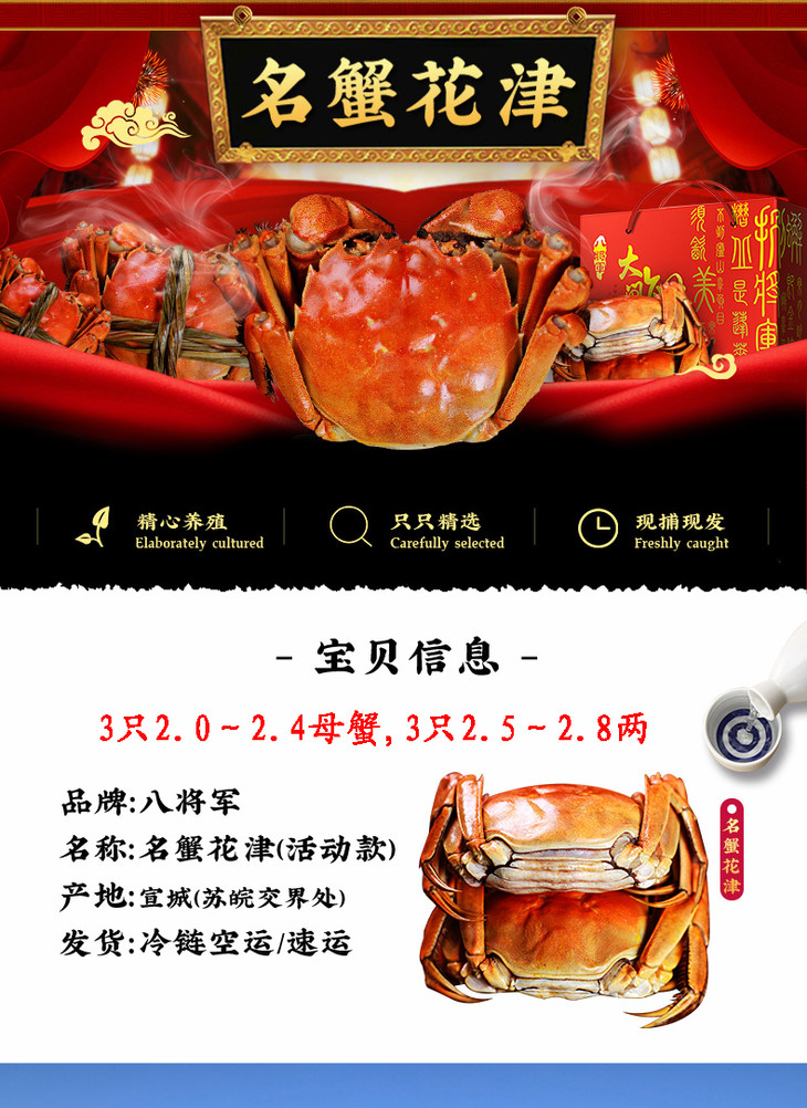 爆款二:3只母蟹2.0~2.4两,3只公蟹2.5~2.8两,共6只;