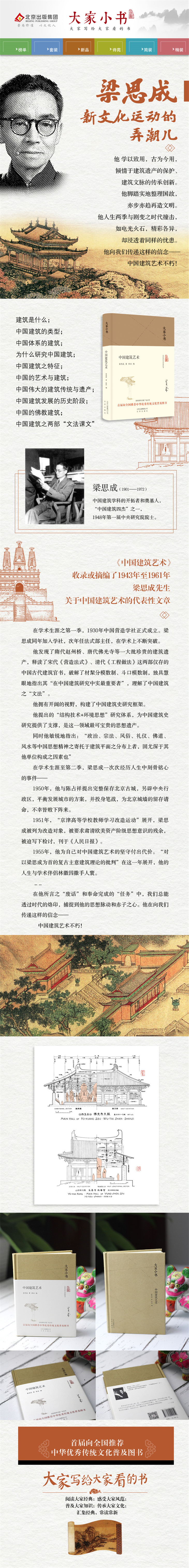 本书是建筑大师写给普通人的小书,收录了梁思成先生1943年至1961年关于中国建筑艺术的代表性文章,此一时期,正是梁思成学术生涯的第二阶段。本书从“建筑是什么”讲起,从类型、体系、特征、艺术,甚至文化遗产的角度对中国建筑做了深入浅出的分析,“中国建筑发展的历史阶段”等文则以时间为轴,简单梳理了中国建筑史,并重点讲了佛教建筑在中国落地、生根、发芽的脉络。纵观梁思成先生的一生,其写作一向兼顾学术性与普及性,文笔优美,深入浅出,在平实的叙述中表达学术观点,若干篇什甚至可作散文读。因此,对于专业读者来说,阅读本书,可重温梁思成的学术观点,而对于普通读者来说,本书则可说是一本了解中国建筑艺术的优秀读物。
