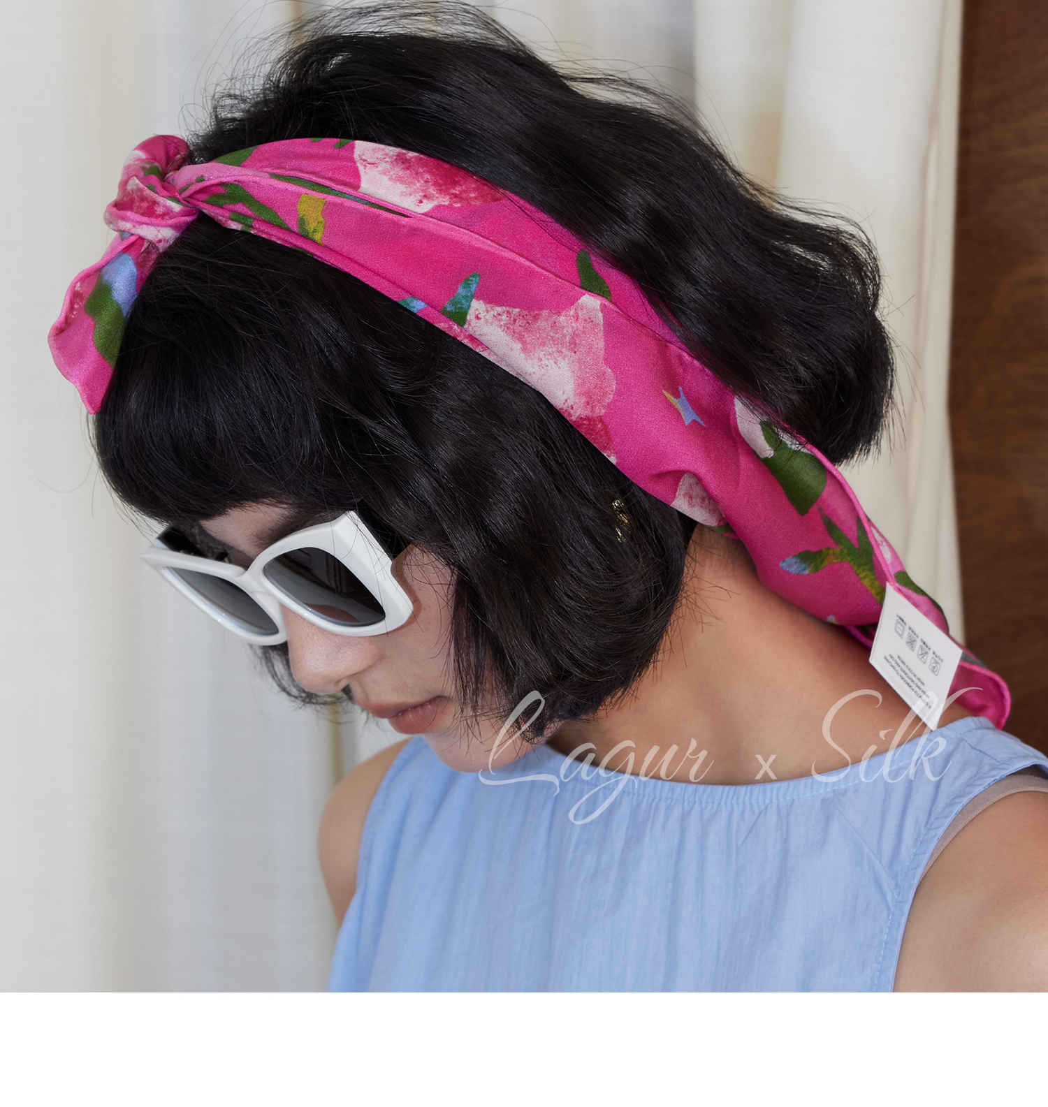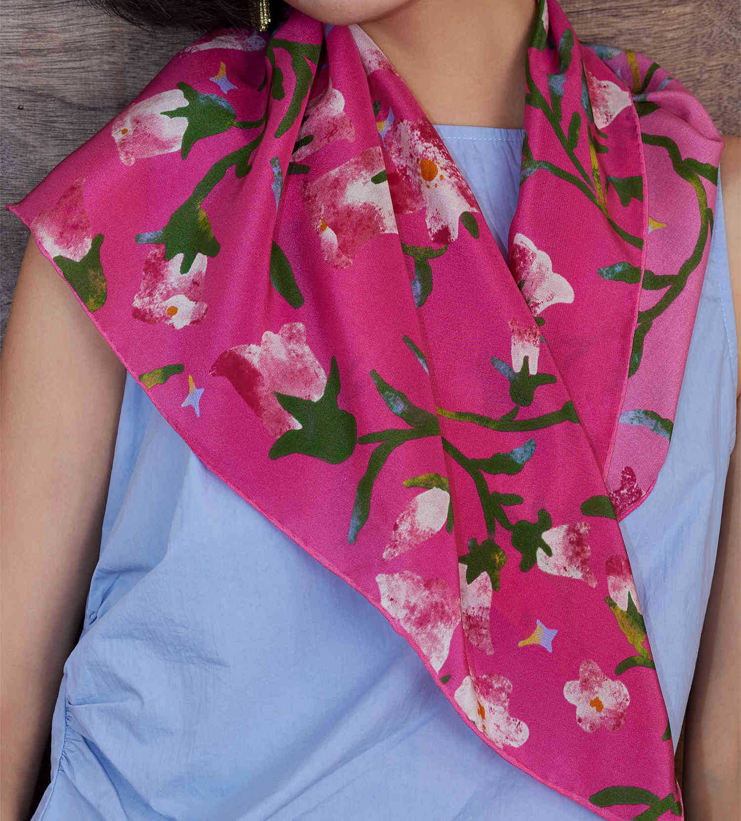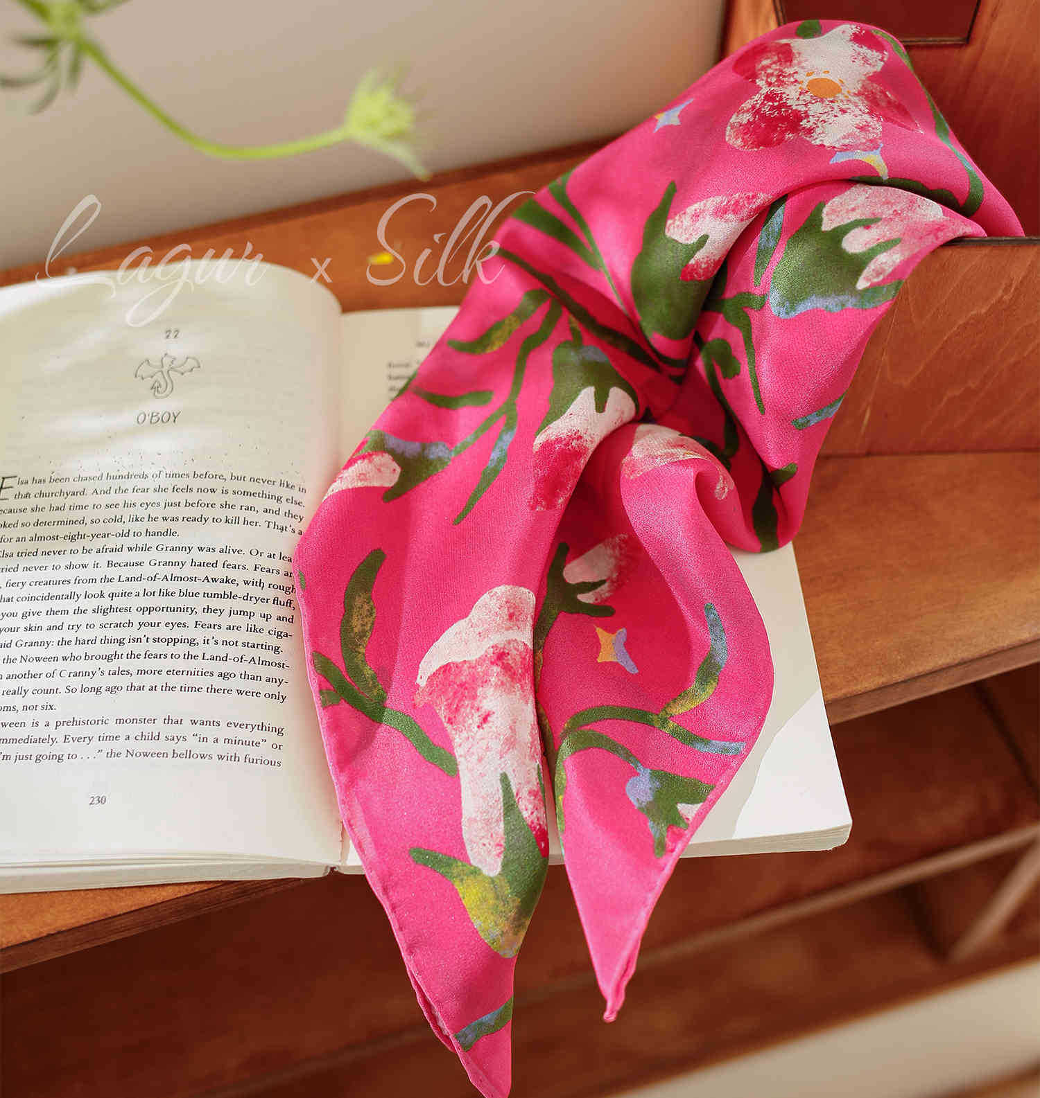 2025-原创风铃花桑蚕丝方巾「玫红色牵牛花」原创手工精卷100%桑蚕丝丝巾方巾真丝高级感秋女
