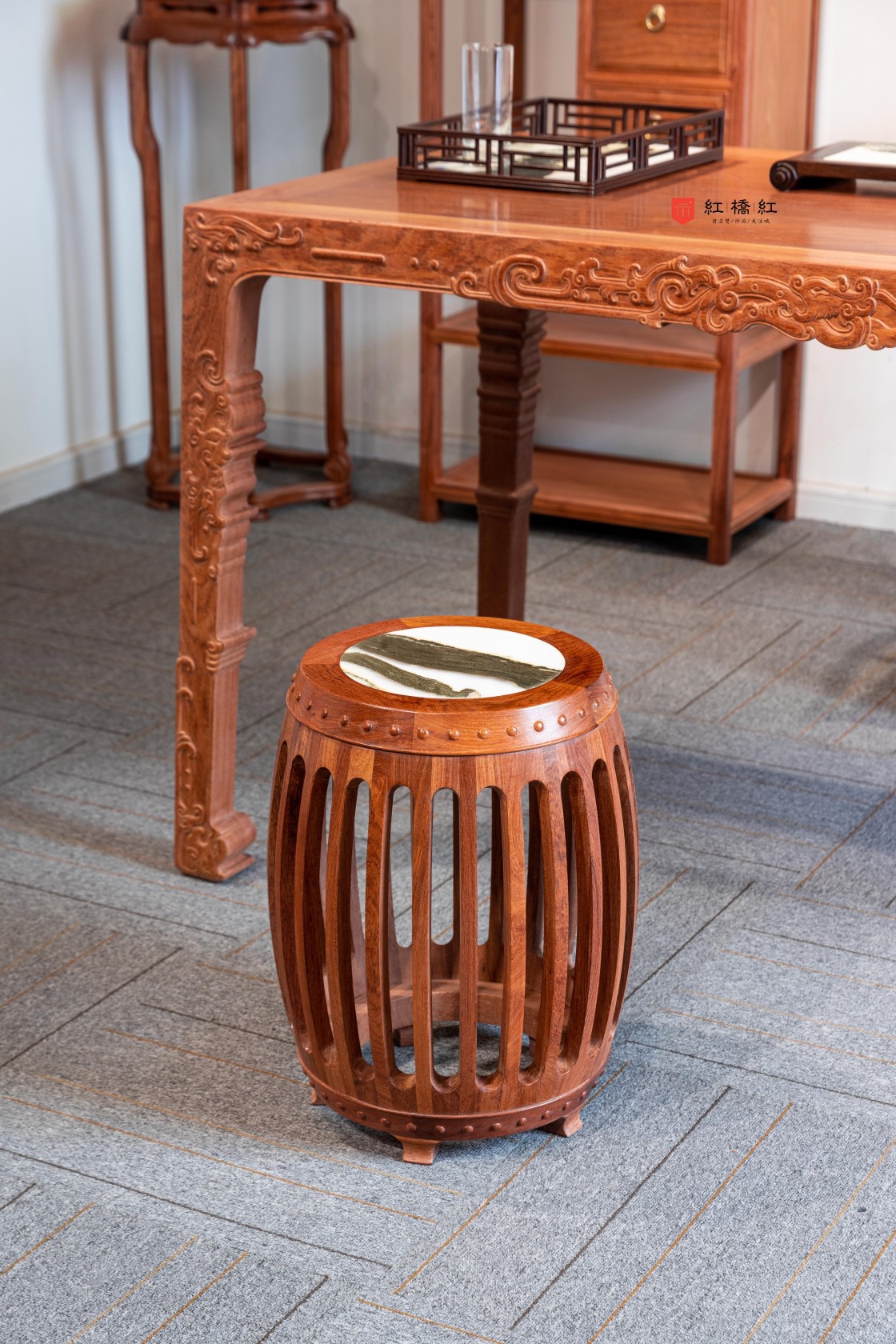 48石面 直棂式鼓凳:鼓凳形状似鼓,座面呈圆形,攒边框镶云石面面心;上下两排鼓钉整齐规矩,之间各起一道弦纹对称。腹部腔体膨出,由24根长条,上下各以短条相间而成,木条和短材断面皆为弧形,工艺十分考究。托泥下承六矮足,玲珑别致。整体造型通明灵秀,清雅不俗。