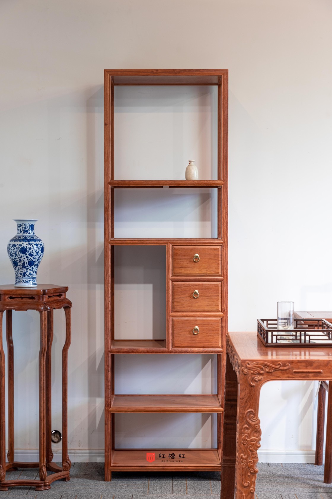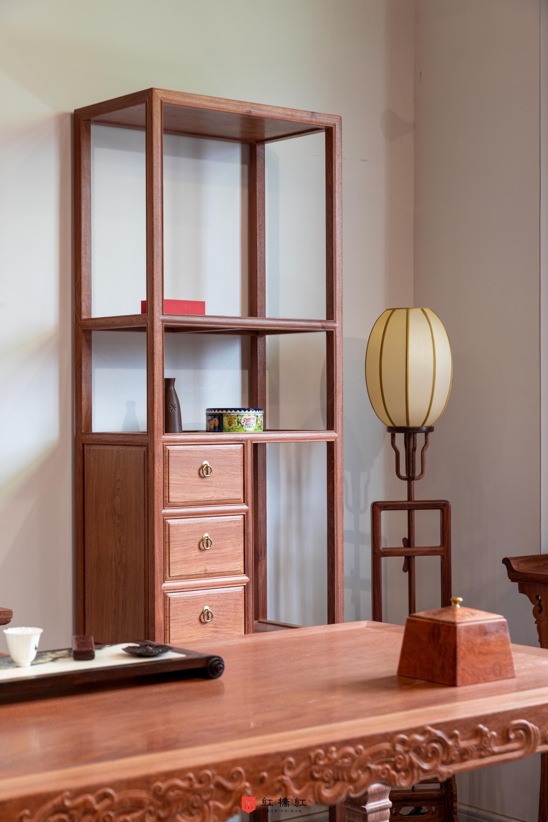 200三抽屉层架:架格全身光素,极致简约,是明式家具架格类的最基本形式,架格以四根方材立柱为足,以横板将空间分隔成五层,每层以横枨包独板面,面下有穿戴,中部另设抽屉三具,增加储物功能。可用于陈列书籍、物品,因其占地较小,用途又不止于此,无论搭配茶桌,放在房间拐角处置物,或用于成排的展示性陈列都十分的出彩和百搭。
