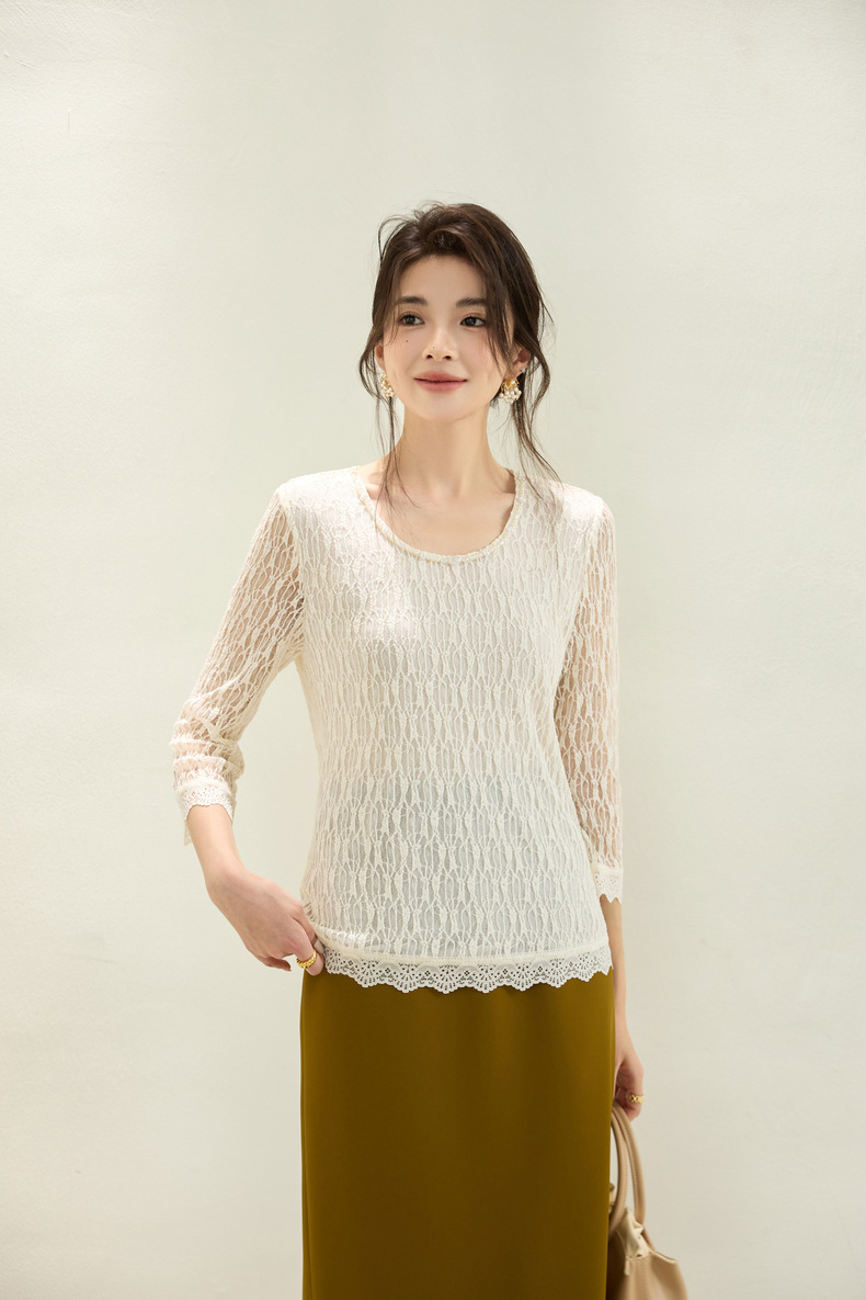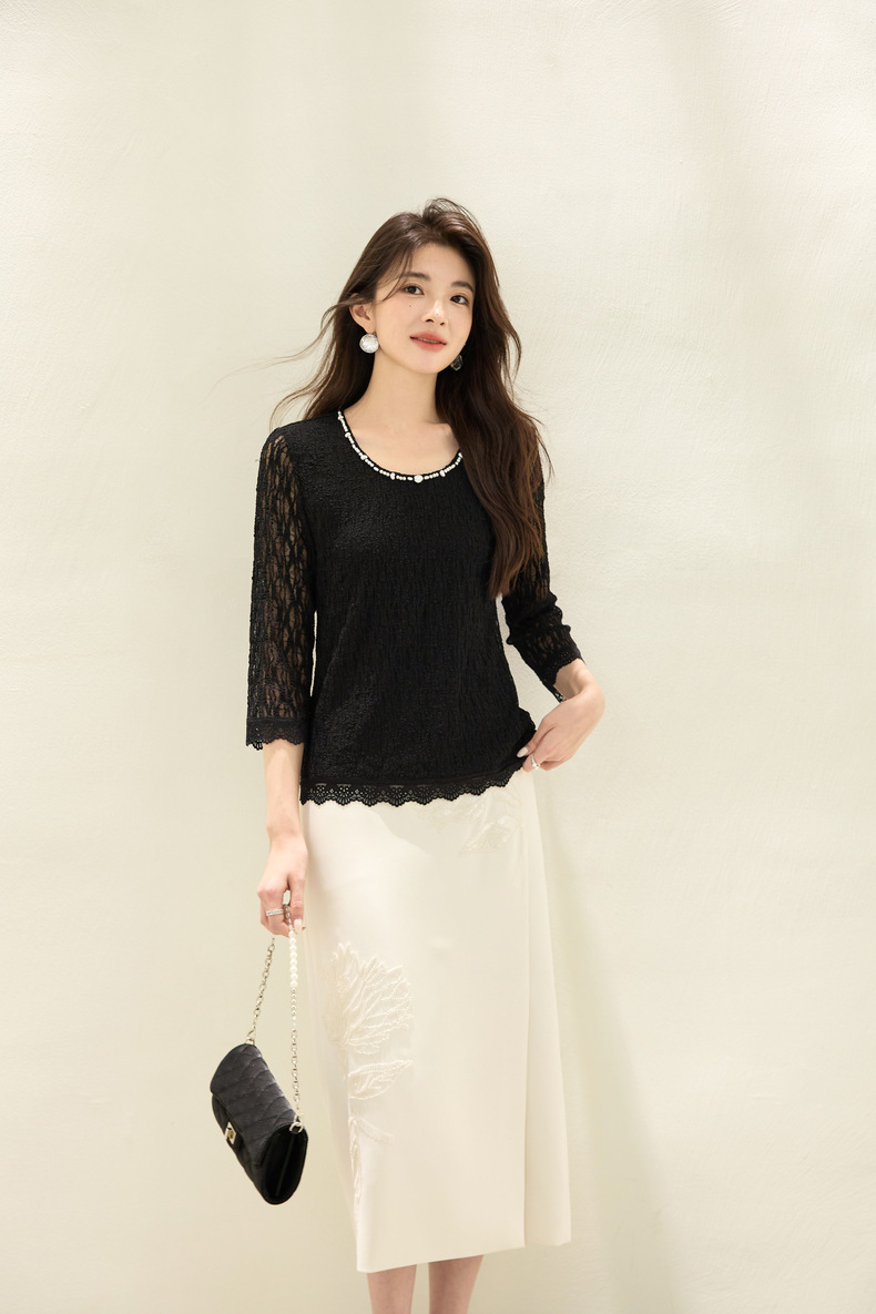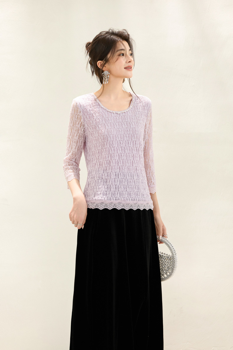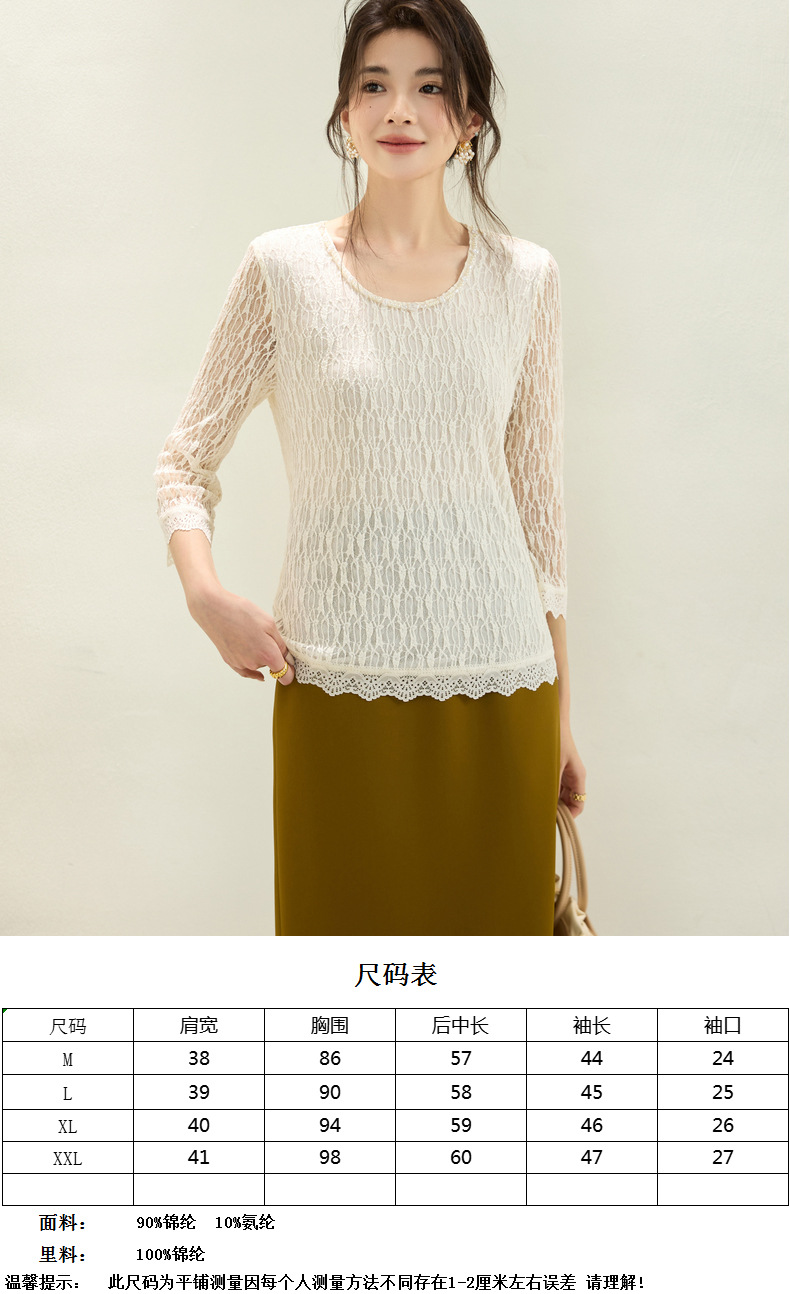 「自」全新升级【铂金会员174/天猫229/差价55】(43622)洛诗琳新款圆领钉珠长袖2025秋季气质网纱蕾丝打底上衣女