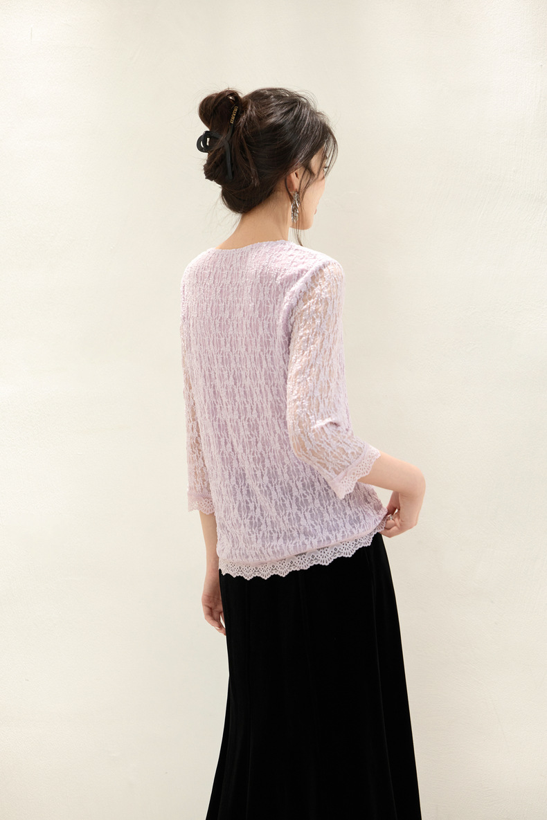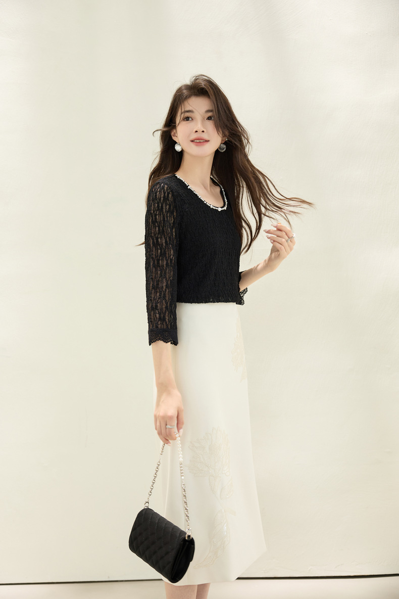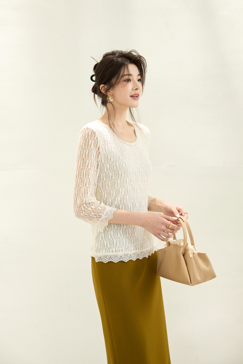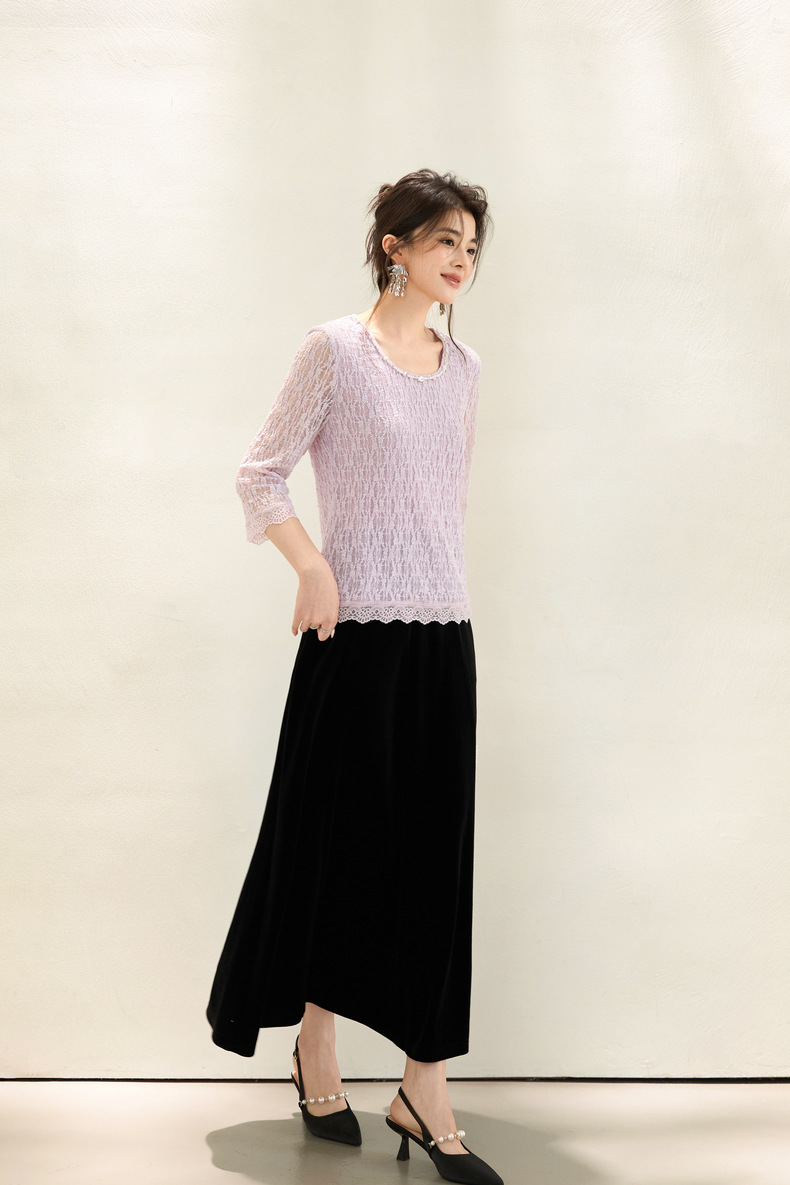 「自」全新升级【铂金会员174/天猫229/差价55】(43622)洛诗琳新款圆领钉珠长袖2025秋季气质网纱蕾丝打底上衣女