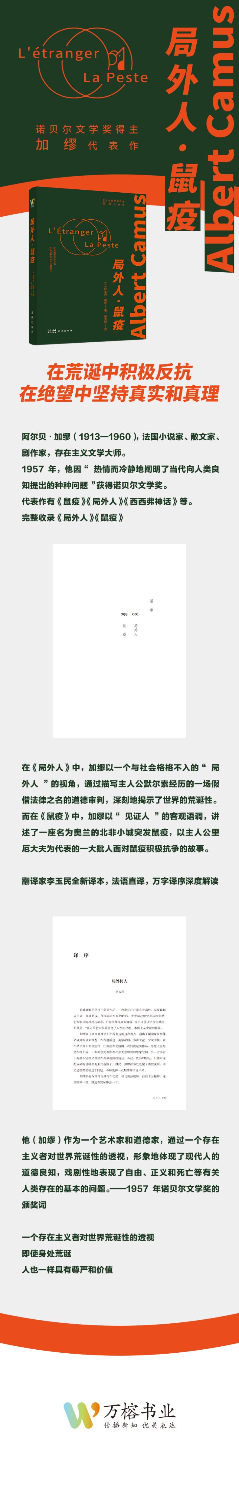 《局外人·鼠疫》收录了文学大师加缪的代表作《局外人》与《鼠疫》。在《局外人》中,加缪以一个与社会格格不入的“局外人”的视角,通过描写主人公默尔索经历的一场假借法律之名的道德审判,深刻地揭示了世界的荒诞性。而在《鼠疫》中,加缪以“见证人”的客观语调,讲述了一座名为奥兰的北非小城突发鼠疫,以主人公里厄大夫为代表的一大批人面对鼠疫积极抗争的故事。