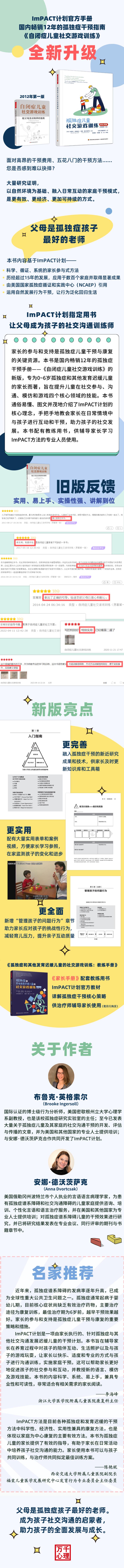 家长的参与和支持是孤独症儿童干预与康复的关键资源。本书是国内畅销12年的孤独症干预手册——《自闭症儿童社交游戏训练》的新版,专为0~6岁孤独症和其他发育迟缓儿童的家长而著,旨在提升儿童在社交参与、沟通、模仿和游戏四个核心领域的技能。书中内容基于ImPACT(Improving Parents As Communication Teachers,让家长成为孩子的沟通训练师)计划——一套循证、科学、有效的自然发展行为干预方法。该方法有坚实的循证实践证据,已历经15年发展、应用于数百个家庭并取得显著成效。本书通俗易懂、图文并茂地介绍了ImPACT方法的核心理念,手把手地教会家长在日常情境中与孩子进行互动和干预,助力孩子的社交发展。本书配有教练用书,供辅导家长学习ImPACT方法的专业人员使用。