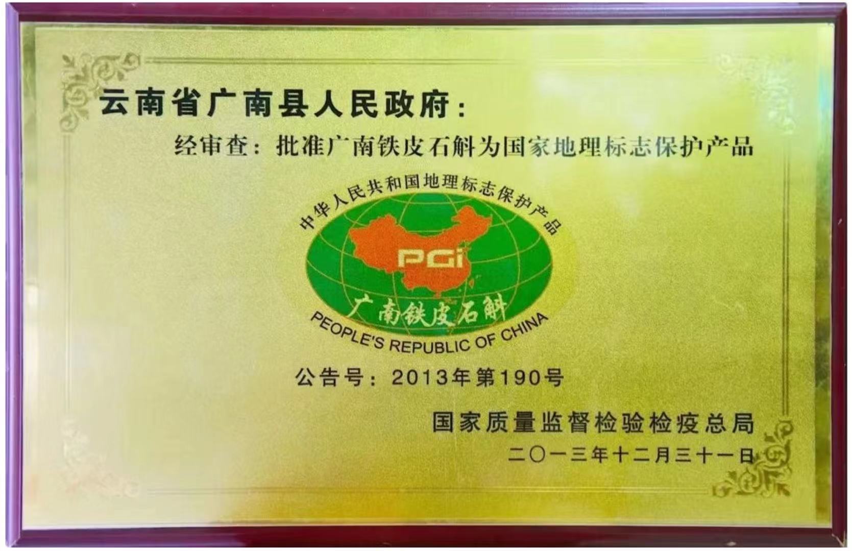 2014年,广南铁皮石斛被列为国家地理标志保护产品,获准"国字号"品牌;