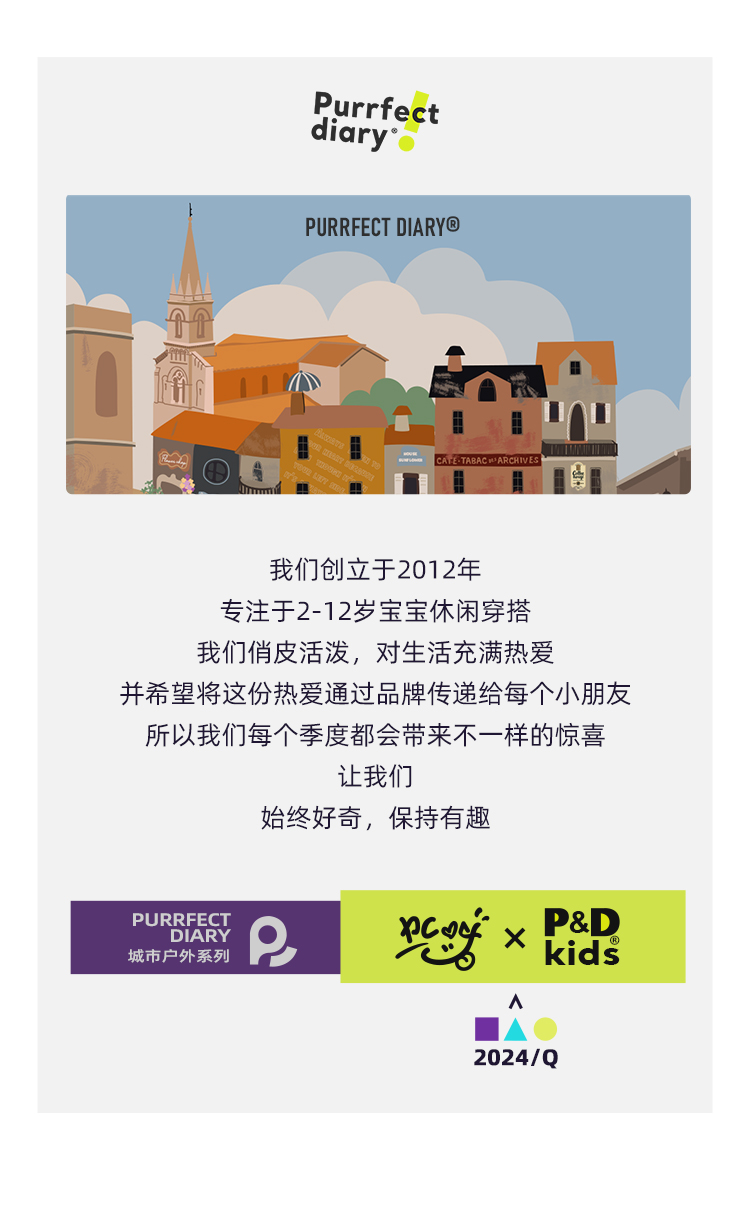 Purrfect-Diary专注于贴近自然随性的穿着概念,轻奢平价的童装文化传播,在产品设计上更加注重婴童穿着的舒适性、安全性、更出众的国际化品牌,将欧美的育婴文化在中国进行深入的传播与推广。