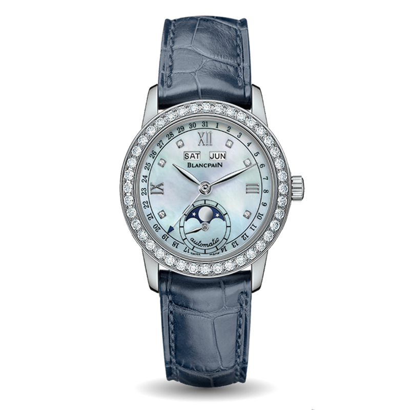 镜面材质 | 蓝宝石水晶玻璃 | 表盘 | 精钢镶钻表壳 珍珠贝母表盘,搭配罗马数字和钻石刻度 月份 星期 月相显示 日期指针 |