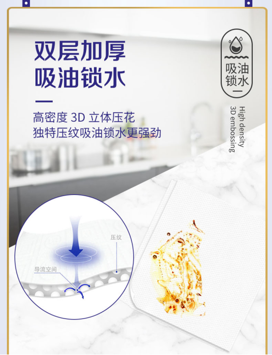 双层加厚设计,高密度3D立体压花,更能吸出厨房的油渍