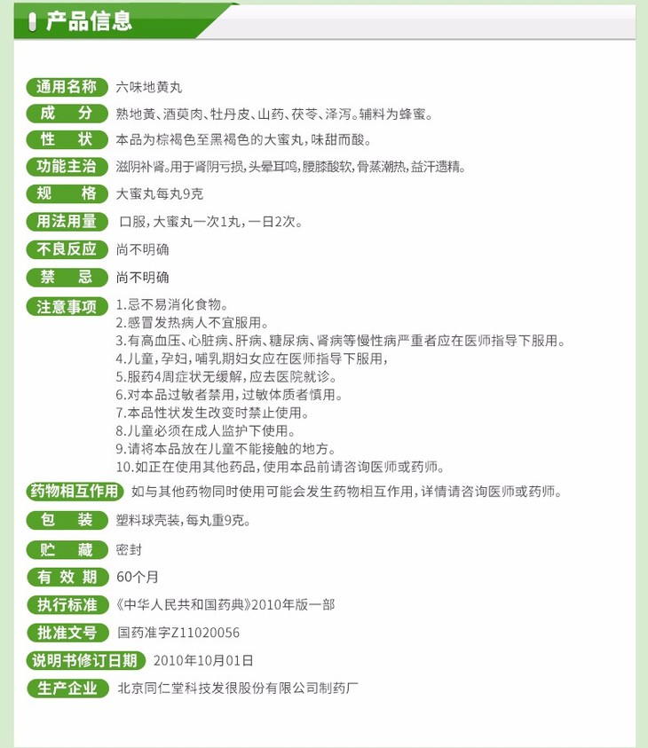 同仁堂 六味地黄丸(大蜜丸)9g*10丸【药房直供】