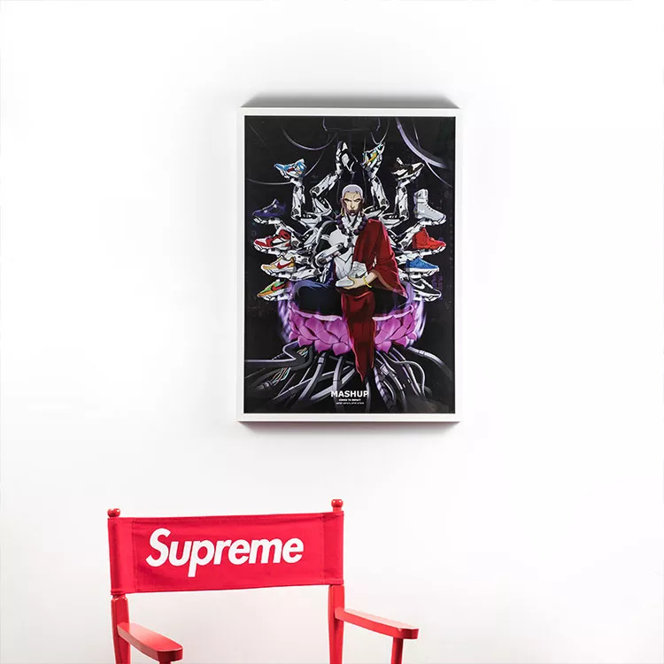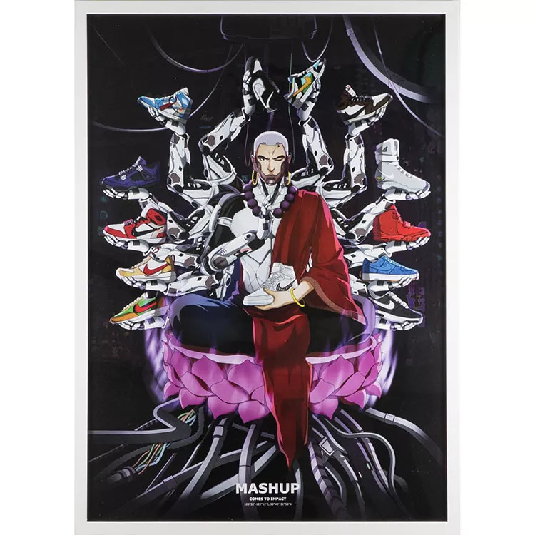 作品以千手观音为缪斯,以硬汉机甲为设计概念,观音坐在莲花之上,托举着各年度“鞋王”,将潮流、机甲、佛教元素完美呈现