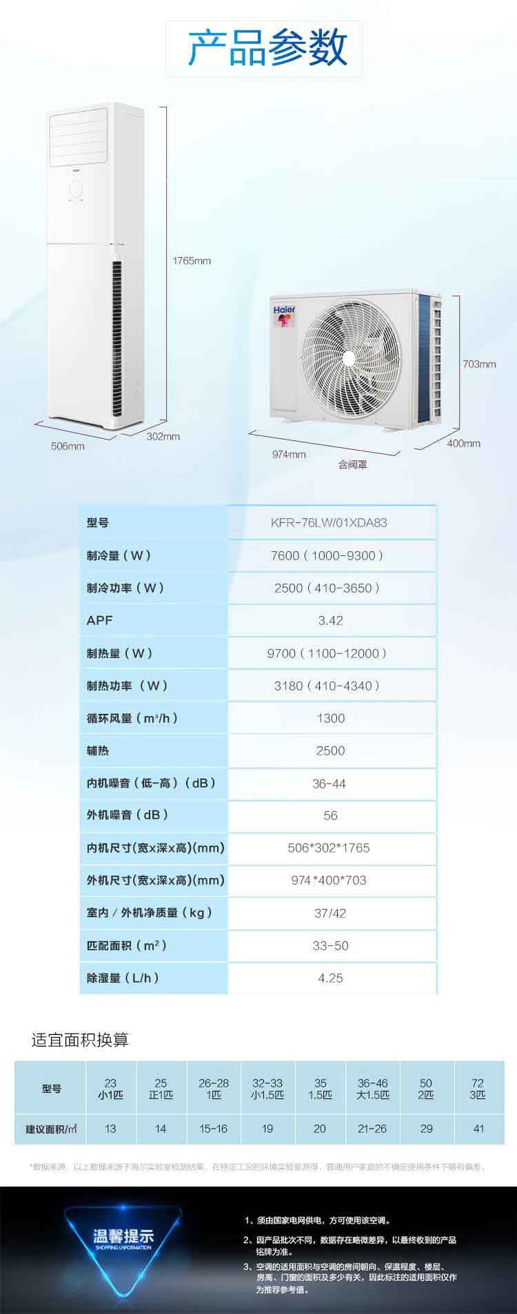 海尔 (140181)大3匹空调柜机三级能效变频自清洁防直吹强效制冷立式空调标准安装KFR-76LW/01XDA83