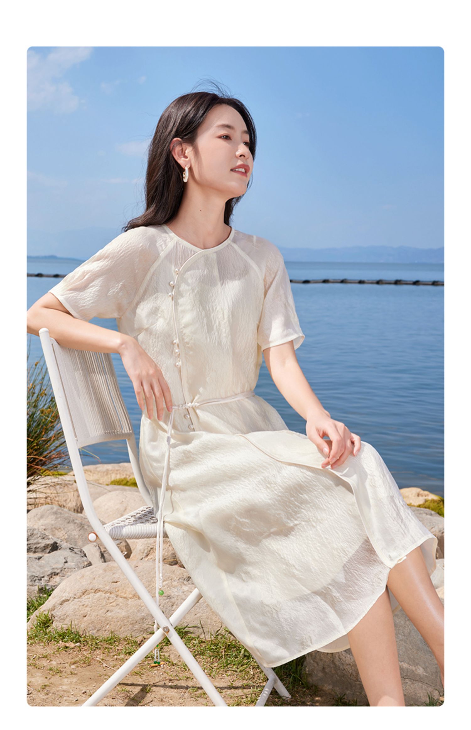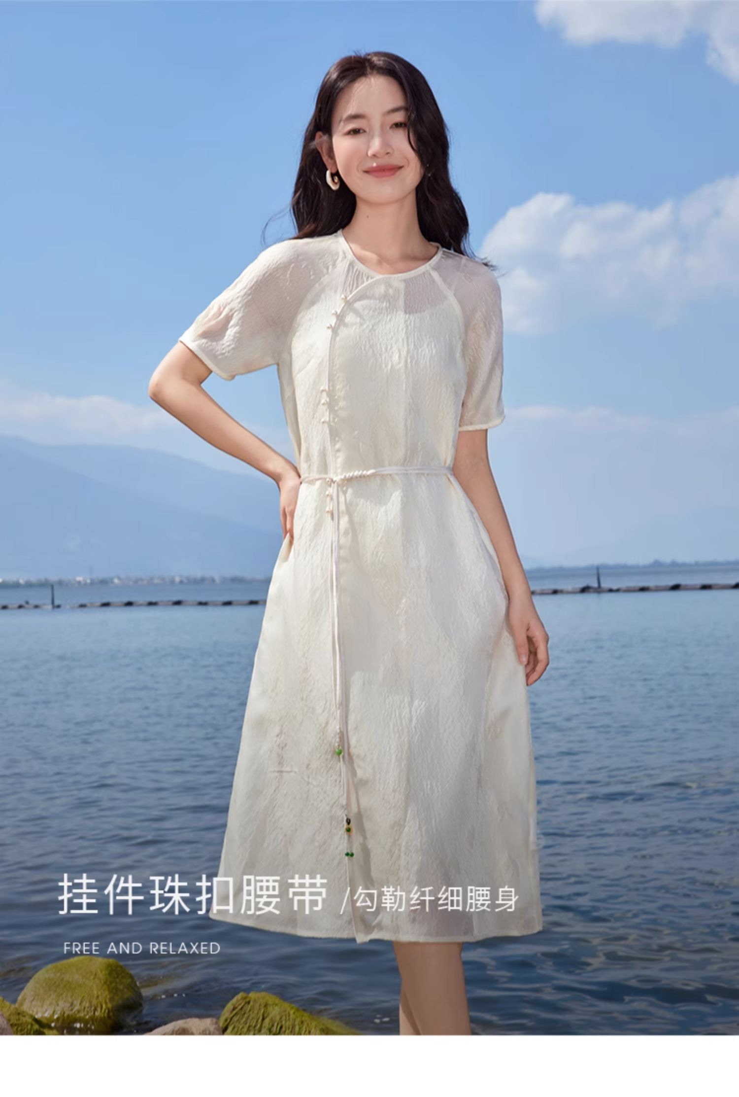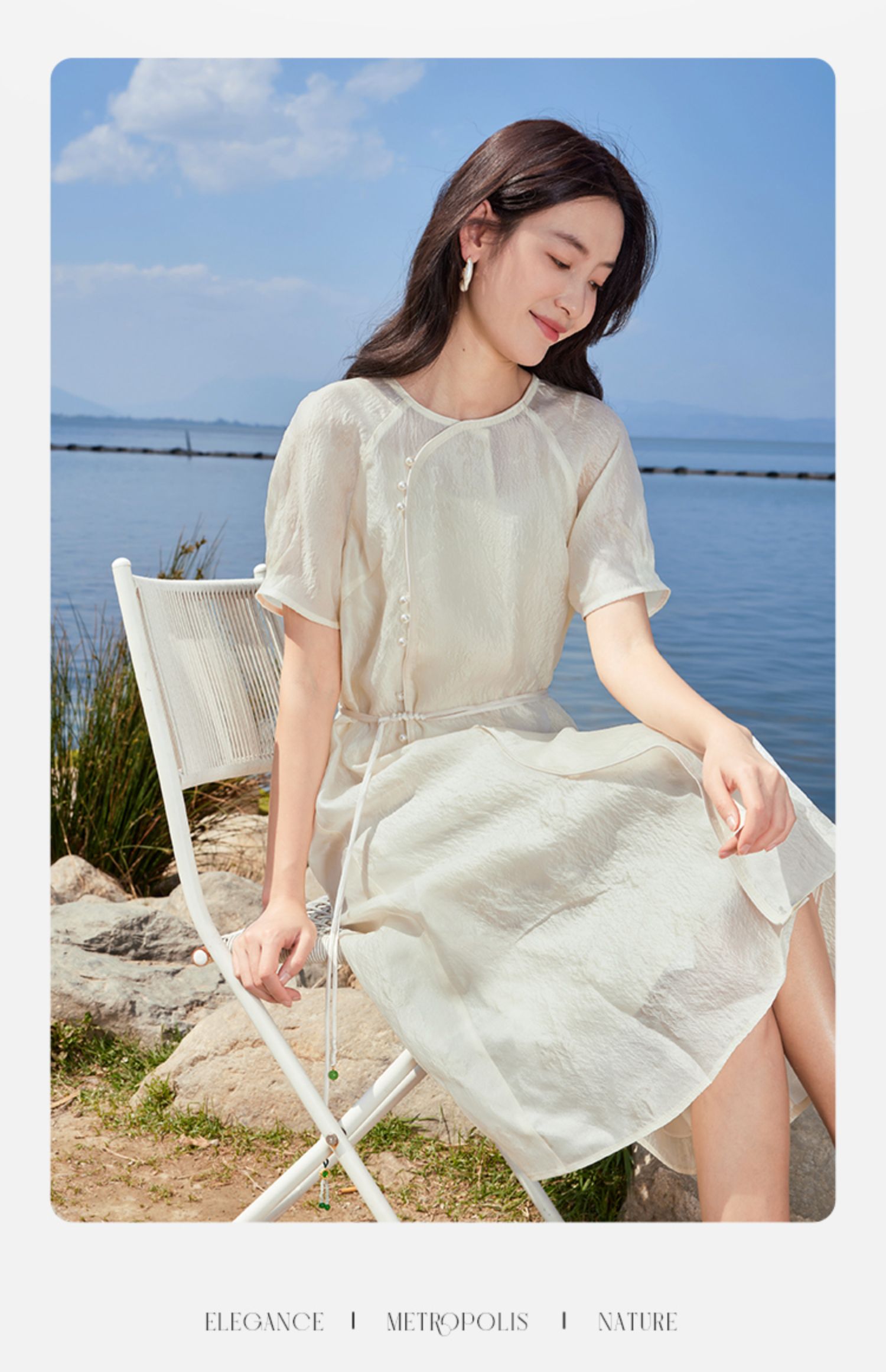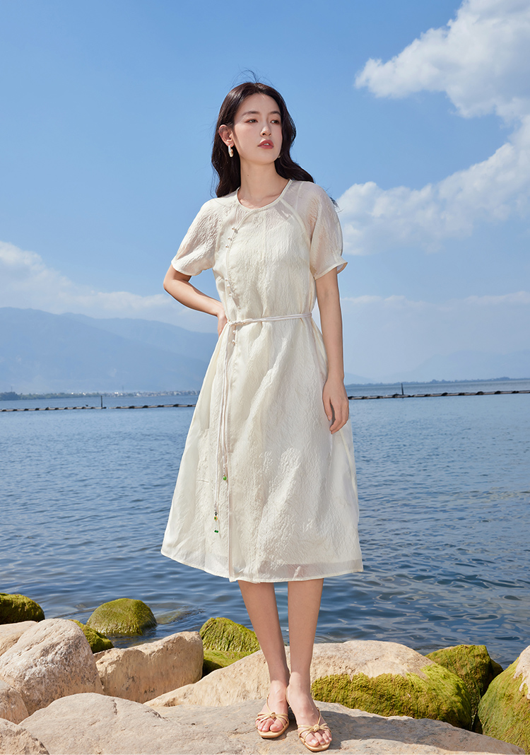 【专属特价】熙世界欧根泡泡纱国风连衣裙2025夏新中式珠扣腰带白色仙女裙子