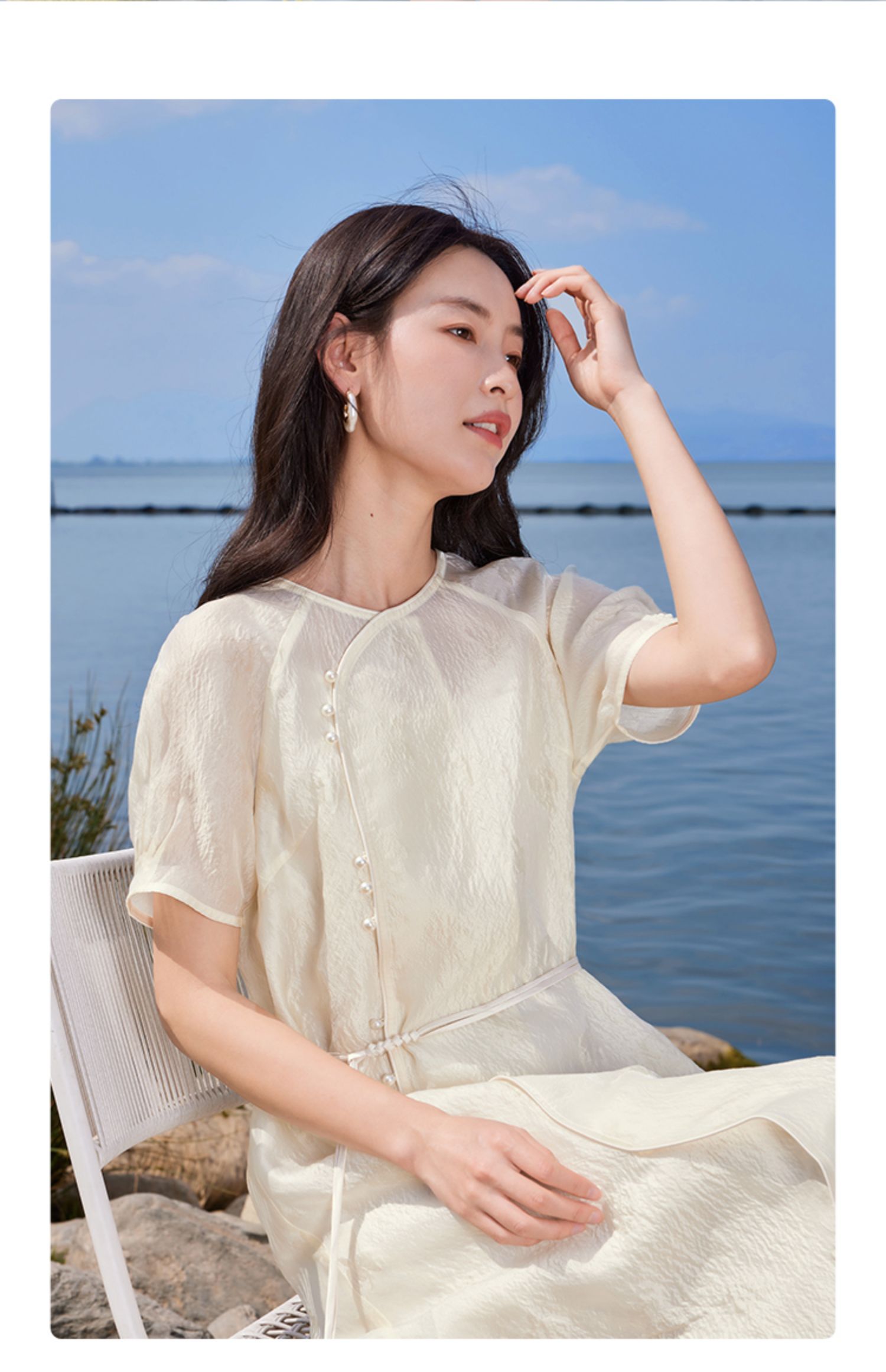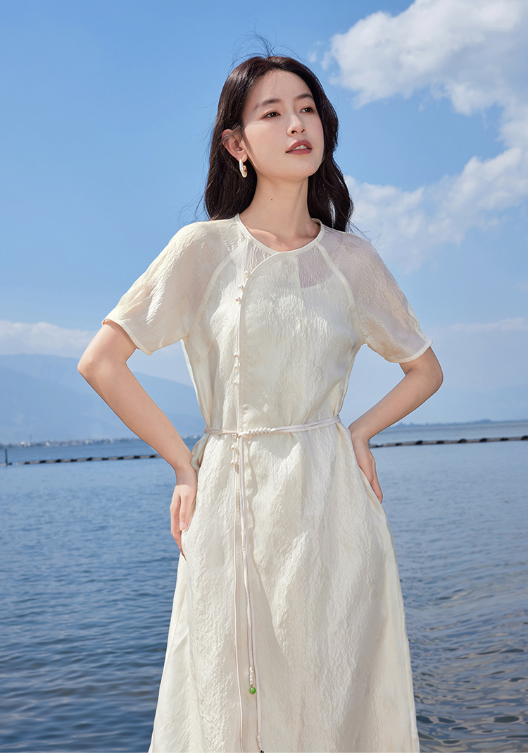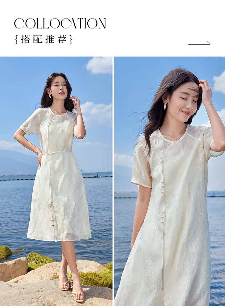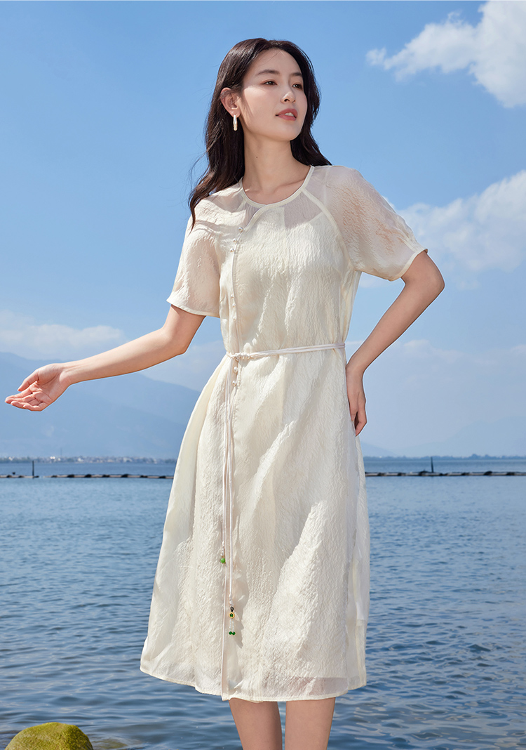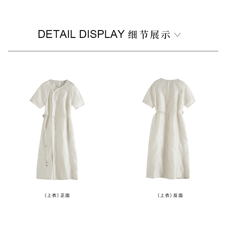【专属特价】熙世界欧根泡泡纱国风连衣裙2025夏新中式珠扣腰带白色仙女裙子