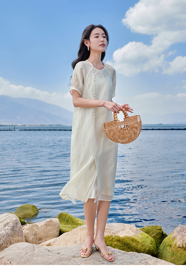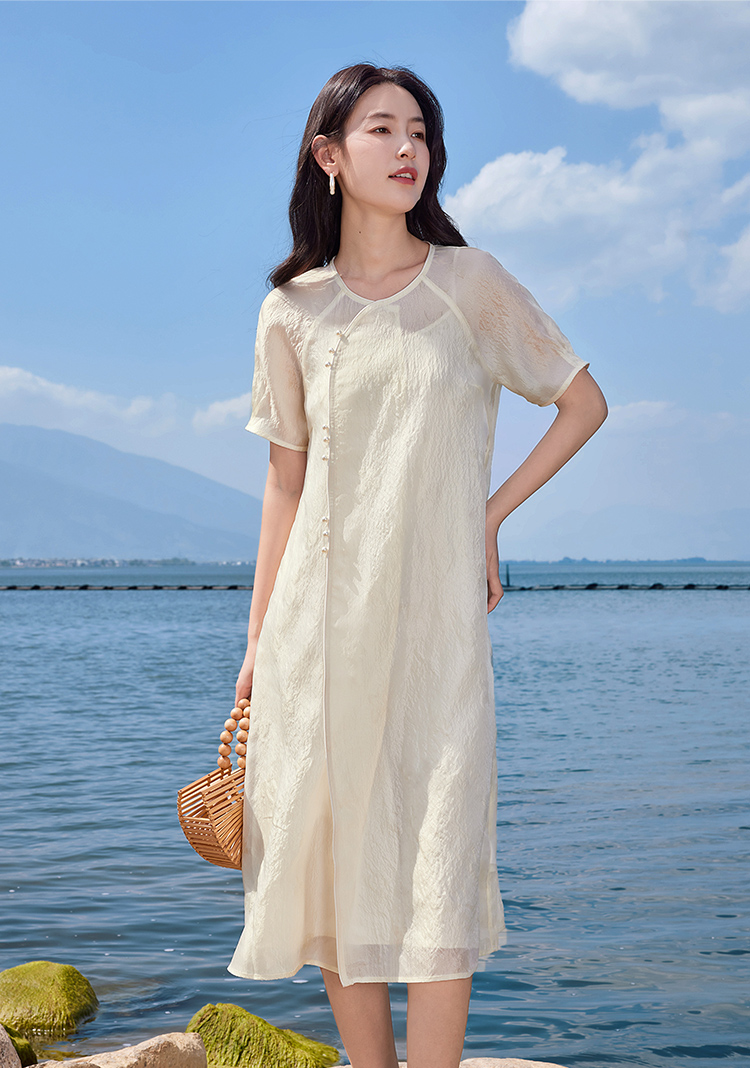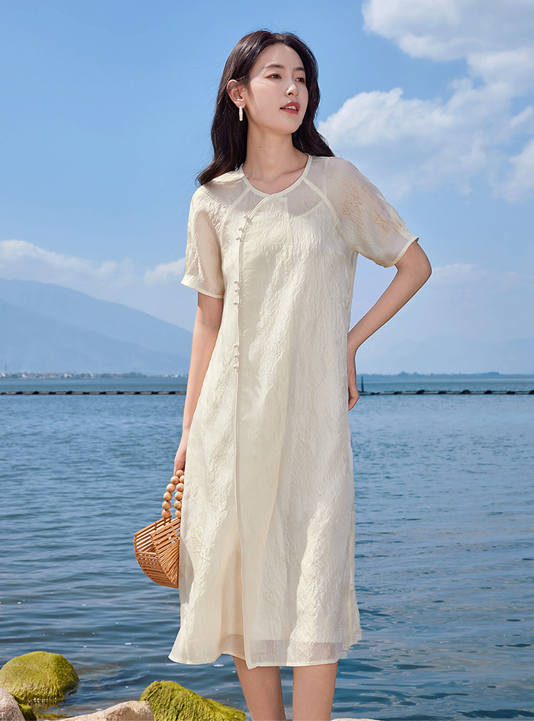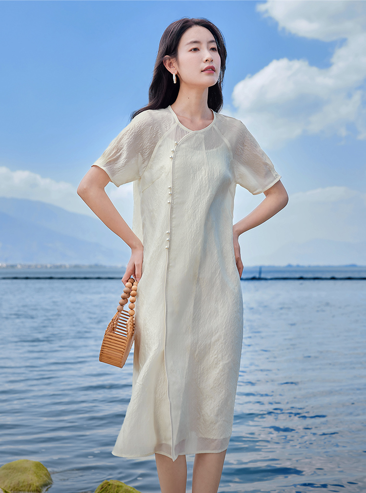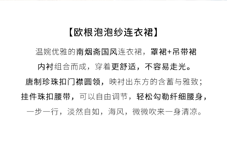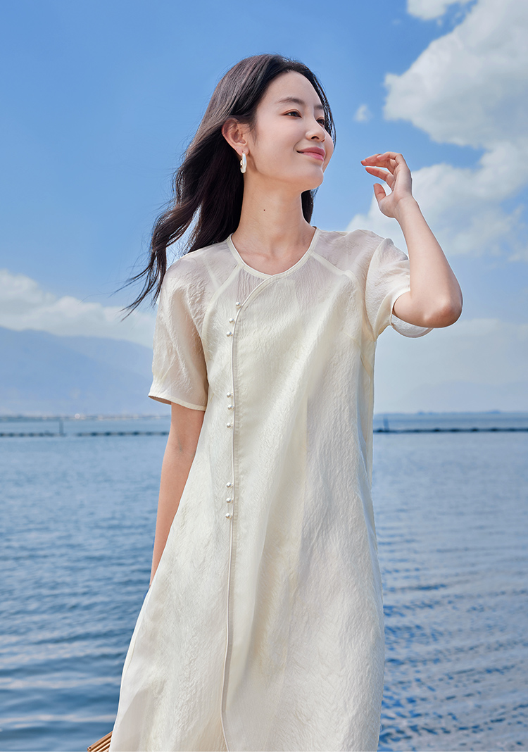 【专属特价】熙世界欧根泡泡纱国风连衣裙2025夏新中式珠扣腰带白色仙女裙子