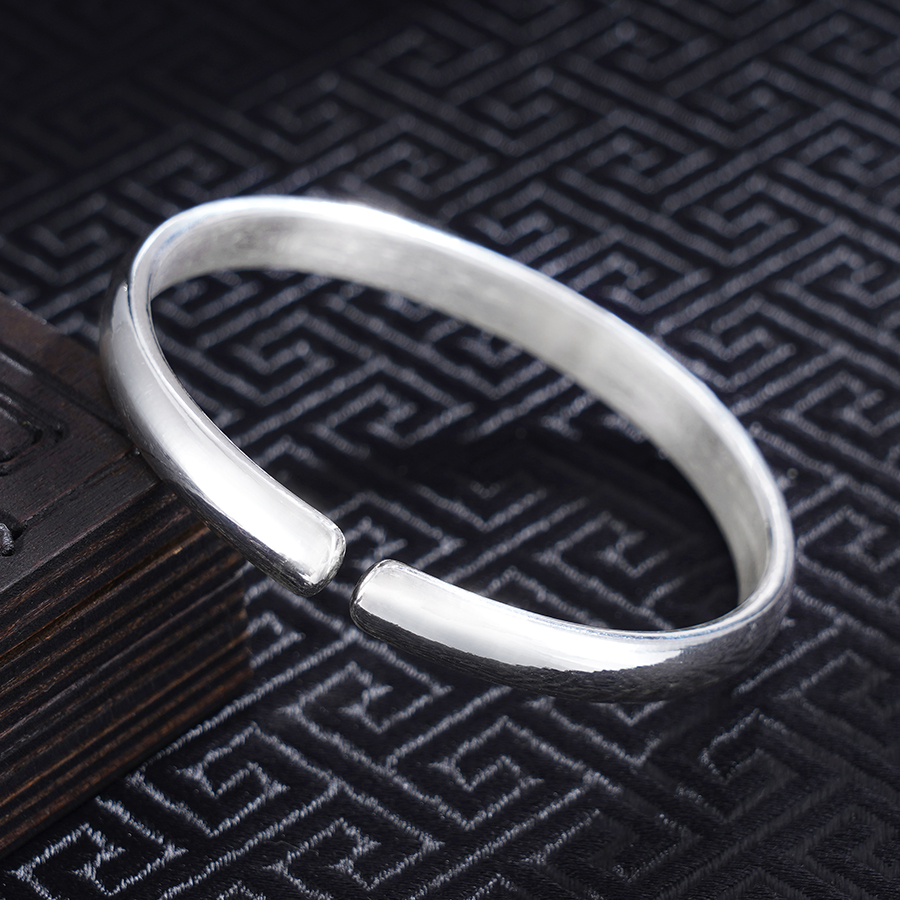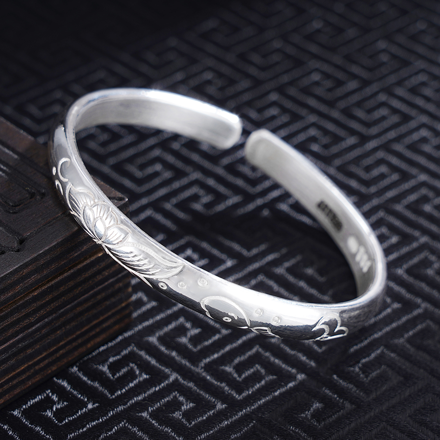 【寓意】:纯银开口手镯,镯面錾刻游鱼戏莲之景,辅以抛光工艺,更显婉约清雅。寓意好运连连,吉庆有余。