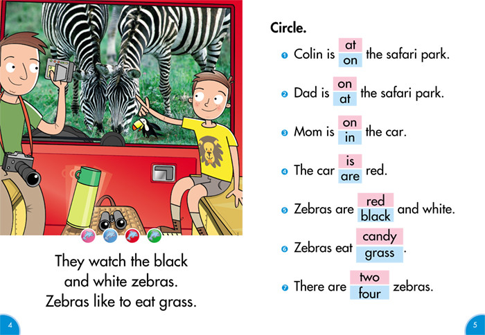 《野生动物园之旅 On Safari》:科林和爸爸妈妈来到了野生动物园,这里有许多平常见不到的野生动物。他们看到了黑白相间的斑马、蹦蹦跳跳的袋鼠、灵巧敏捷的猴子……回家的时间到了,科林十分喜欢的动物还是威风凛凛的狮子。本书故事语言精炼,结合动物摄影图片和生动有趣的插图,小朋友可以从中找到自己喜欢的野生动物!