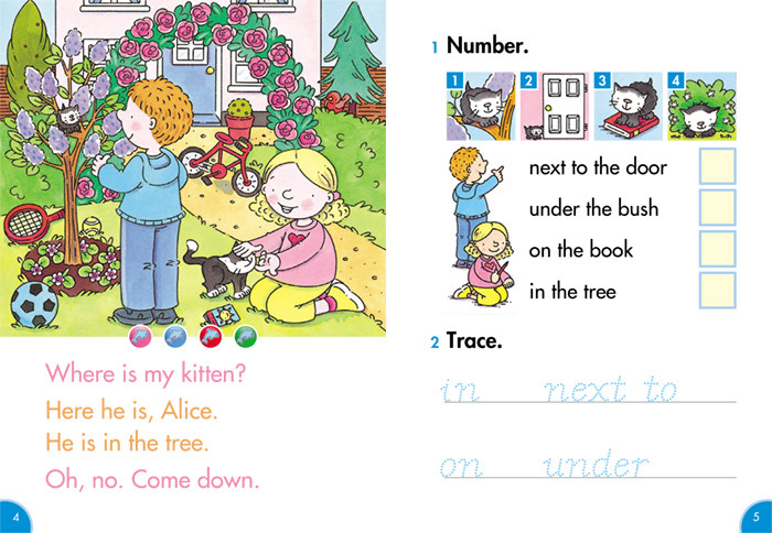 《它在哪儿? Where Is It?》:玩具狮子在哪儿?它在椅子下面。小猫在哪儿?它在树上。笔在哪儿?它们在桌子上。这一天,约翰和爱丽丝变成了找东西的小能手。本书对话精炼生动,小读者可以从中学会用”where is …?"来提问,也可以学会简单描述物品所处的位置。