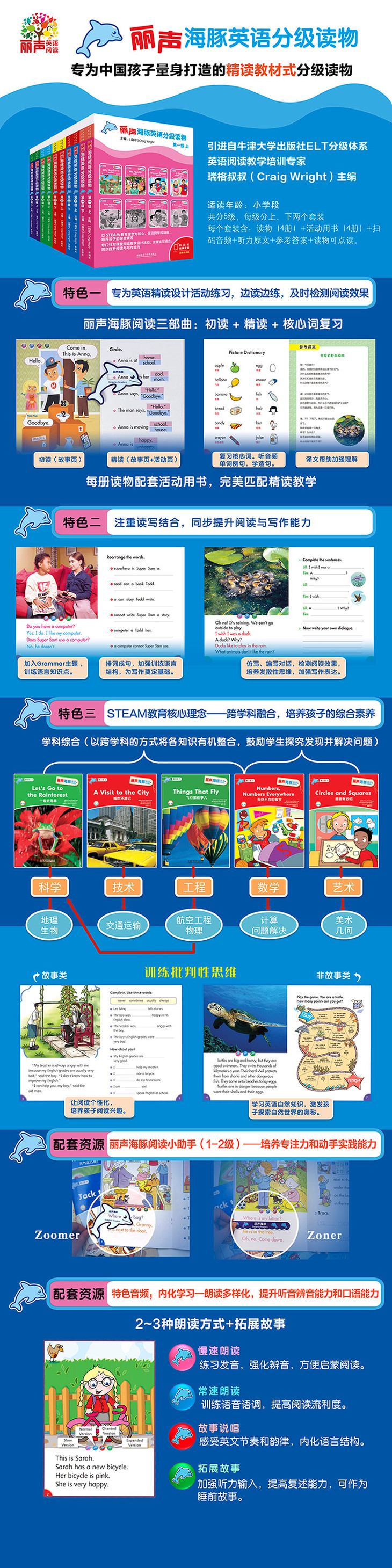“丽声海豚英语分级读物”引进自牛津大学出版社,是一套专门为英语作为第二语言的孩子编写的分级读物,由英语阅读教学专家Craig Wright(瑞格叔叔)主编。“丽声海豚英语分级读物”共分5个级别,每级分上、下两套,每套包含8册图书(4册读物 4册活动用书),可扫码听音频,适合为小学阶段的学生在课堂内开展精读教学使用。另配有教学课件、教学设计、示范课等配套资源。“丽声海豚英语分级读物”可用“外研通”点读笔点读,所需声音文件可到“外研通”官网免费下载。