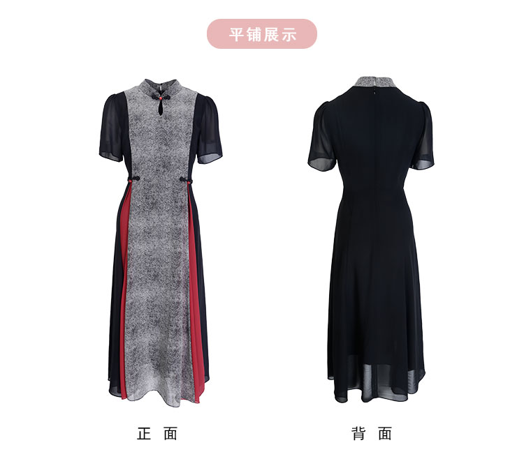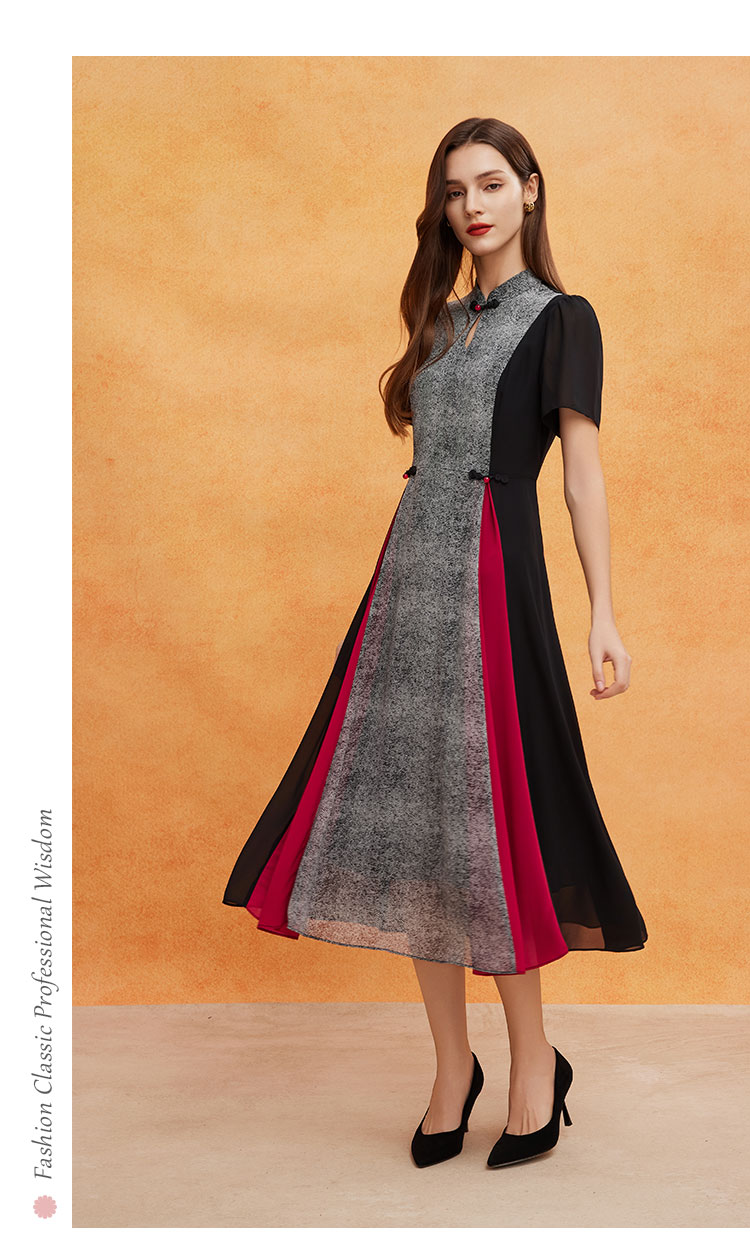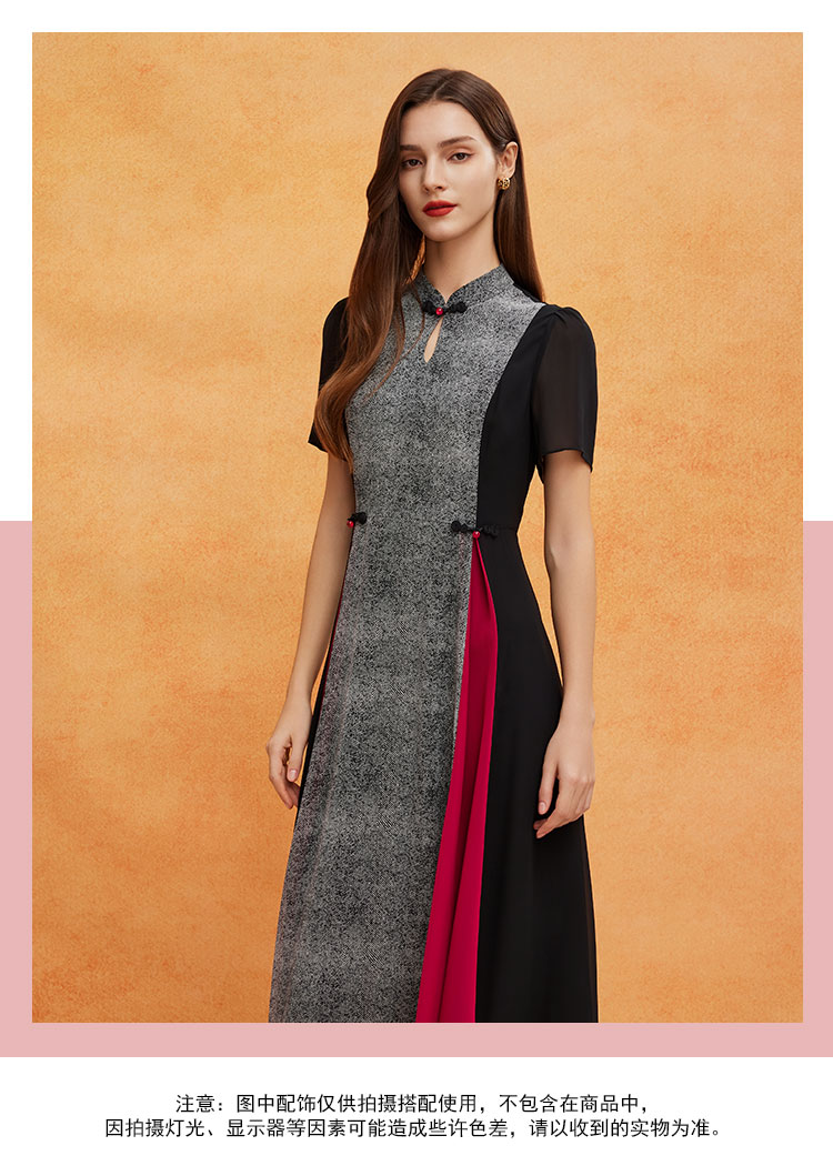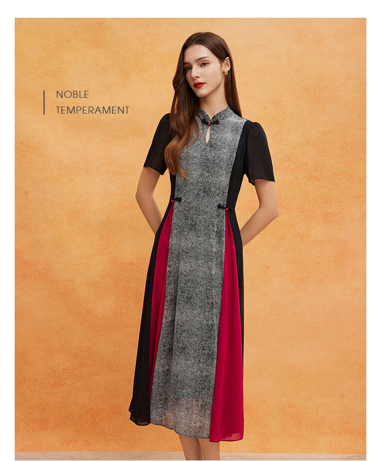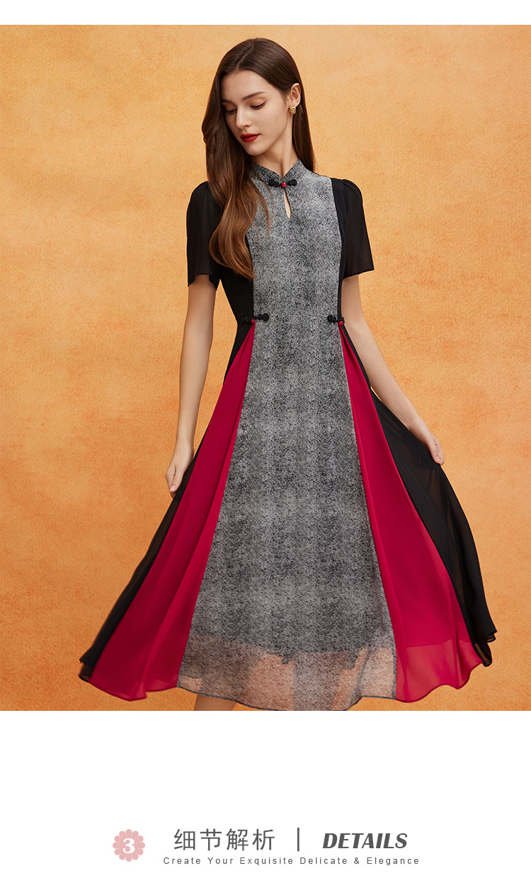 QF813斯尔丽2025新款新国风改良版旗袍收腰放摆插片拼接印花优雅连衣裙